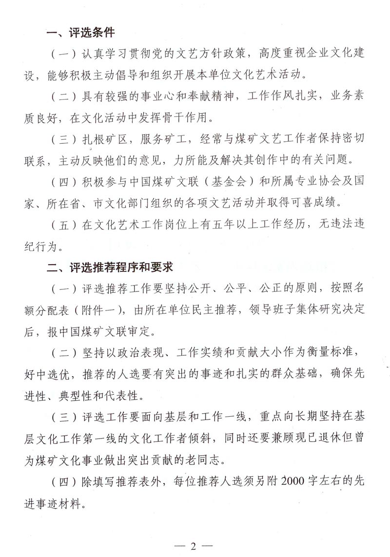 关于筹备召开中国煤矿文联成立20周年座谈会暨推选为繁荣煤矿文化艺术事业做出突出贡献的文化艺术工作者的通知 来源: 作者: 时间:2015-10-30 【字体:小 大】 附件一:为繁荣煤矿文化艺术事业做出突出贡献的文化艺术工作者名额分配表 附件二:为繁荣煤矿文化艺术事业做出突出贡献的文化艺术工作者推荐表 智能标签: 煤矿文联 工作者 相关内容 分享到: 【打印正文】