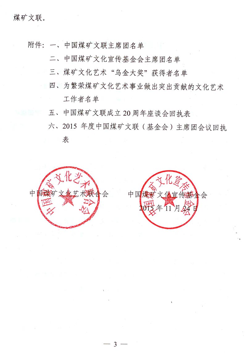 关于召开中国煤矿文联成立20周年座谈会暨2015年度中国煤矿文联(基金会)主席团会议的通知 来源: 作者: 时间:2015-11-27 【字体:小 大】 附件: 一、中国煤矿文联主席团名单 二、中国煤矿文化宣传基金会主席团名单 三、煤矿文化艺术“乌金大奖”获得者名单 四、为繁荣煤矿文化艺术事业做出突出贡献的文化艺术 工作者名单 五、中国煤矿文联成立20周年座谈会回执表 六、2015年度中国煤矿文联(基金会)主席团会议回执表 智能标签: 中国煤矿文联 基金会 相关内容 分享到: 【打印正文】
