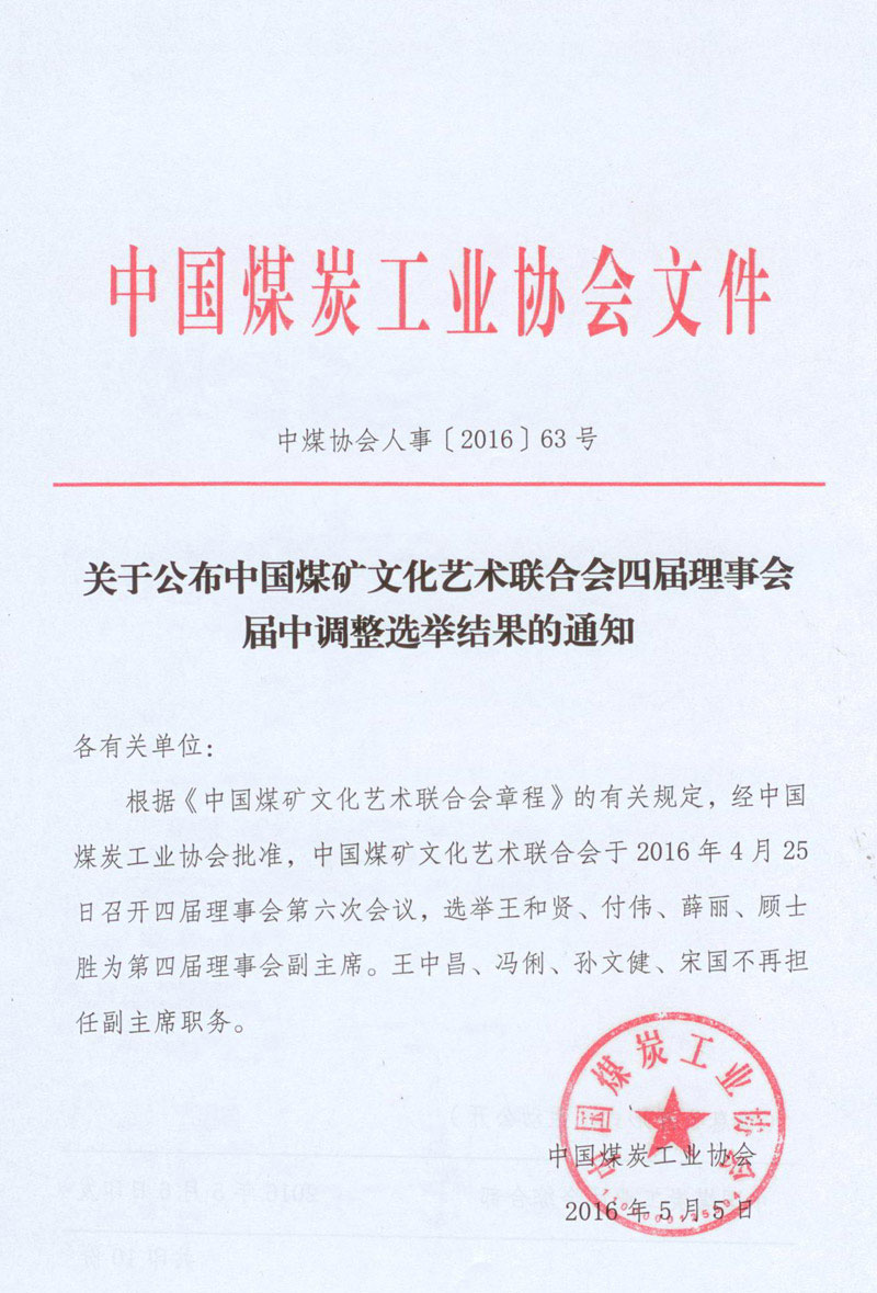 关于公布中国煤矿文联四届理事会届中调整选举结果的通知