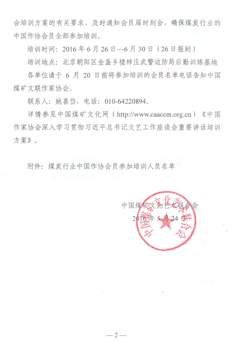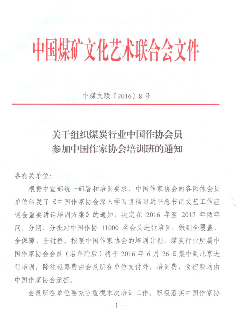 关于组织煤炭行业中国作协会员参加中国作家协会培训班的通知 来源:中国煤矿文联 作者: 时间:2016-06-01 【字体:小 大】 附件:煤炭行业中国作协会员参加培训人员名单 中国作家协会深入学习贯彻习近平总书记文艺工作座谈会重要讲话培训方案 智能标签: 中国作家协会 相关内容 分享到: 【打印正文】
