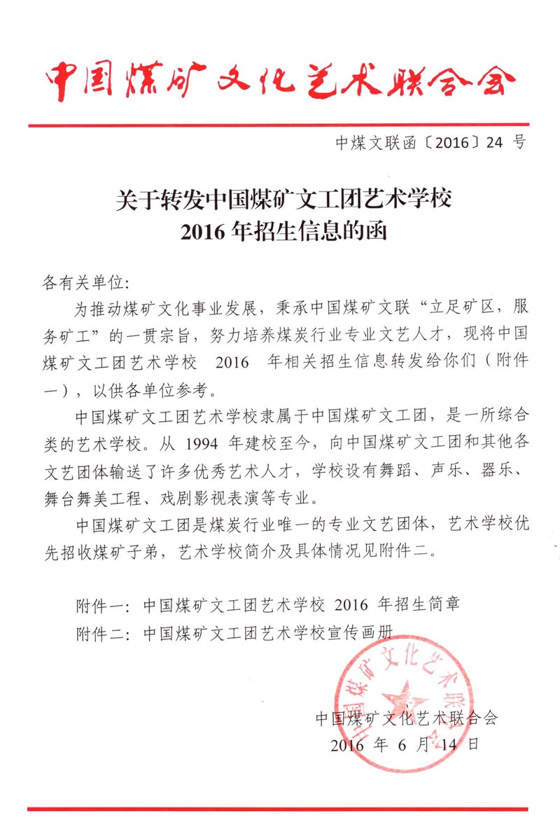 关于转发中国煤矿文工团艺术学校2016年招生信息的函 来源:中国煤矿文联 作者: 时间:2016-06-14 【字体:小 大】 附件一:中国煤矿文工团艺术学校2016年招生简章 附件二:中国煤矿文工团艺术学校宣传画册 分享到: 【打印正文】
