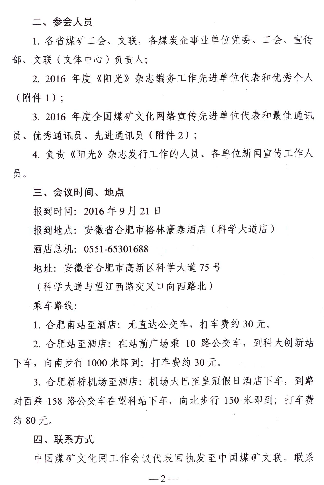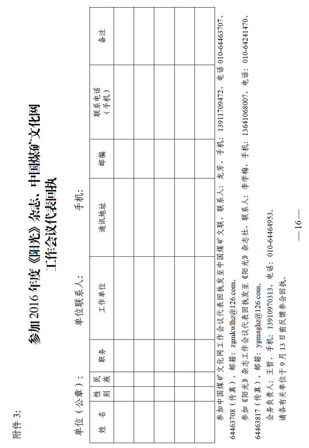 关于召开2016年度《阳光》杂志、中国煤矿文化网工作会议的通知 来源:中国煤矿文联 作者: 时间:2016-08-31 【字体:小 大】 附件: 1. 2016年度《阳光》杂志编务工作先进单位和优秀个人名单 2. 2016年度全国煤矿文化网络宣传先进单位和最佳通讯员、优秀通讯员、先进通讯员名单 3. 参加会议代表回执 智能标签: 《阳光》杂志 中国煤矿文化网 相关内容 分享到: 【打印正文】