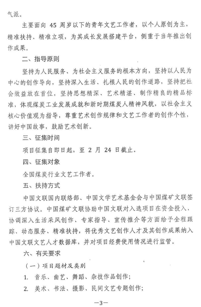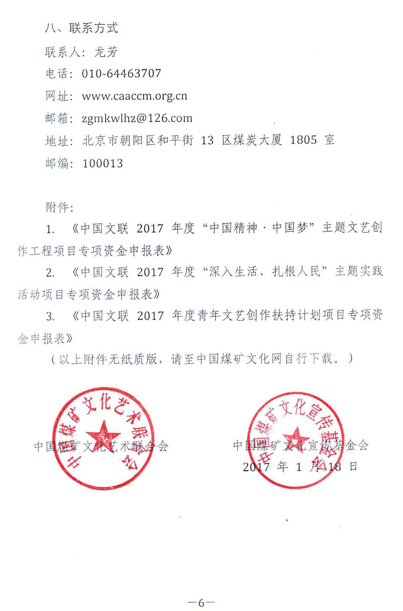 关于征集申报2017年中国文联文艺创作扶持项目的通知 来源:中国煤矿文联 作者: 时间:2017-01-20 【字体:小 大】 附件: 1.《中国文联2017年度“中国精神·中国梦”主题文艺创作工程项目专项资金申报表》 2.《中国文联2017年度“深入生活、扎根人民”主题实践活动项目专项资金申报表》 3.《中国文联2017年度青年文艺创作扶持计划项目专项资金申报表》 具体方案: 1.《中国文联2017年度“中国精神·中国梦”主题文艺创作工程总体方案》 2.《中国文联2017年度“深入生活、扎根人民”主题实践活动总体方案》 3.《中国文联2017年度青年文艺创作扶持计划总体方案》 智能标签: 中国文联 文艺 扶持 相关内容 分享到: 【打印正文】