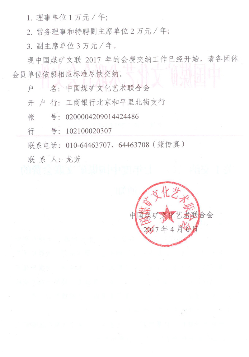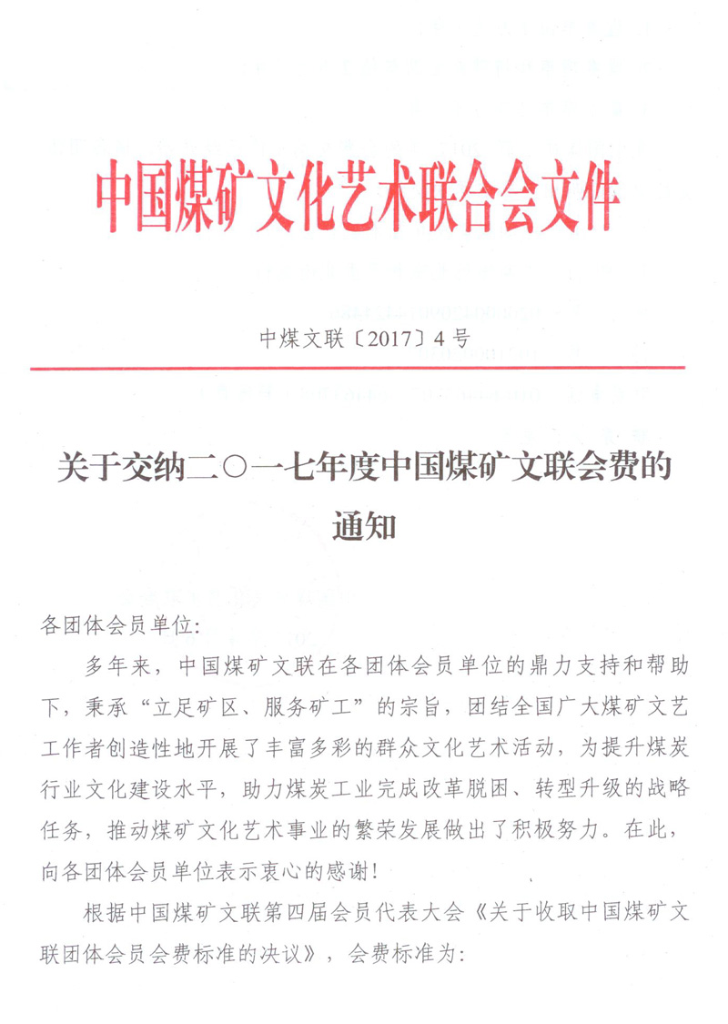 关于交纳二○一七年度中国煤矿文联会费的通知