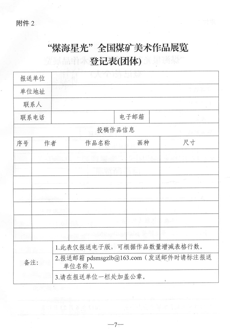 关于举办“煤海星光”全国煤矿美术作品展览的通知 来源:中国煤矿文联 作者: 时间:2017-06-28 【字体:小 大】 附件: 1.“煤海星光”全国煤矿美术作品展览组委会 2.“煤海星光”全国煤矿美术作品展览登记表(团体) 3.“煤海星光”全国煤矿美术作品展览登记表(个人) 智能标签: 中国煤矿文联 相关内容 分享到: 【打印正文】