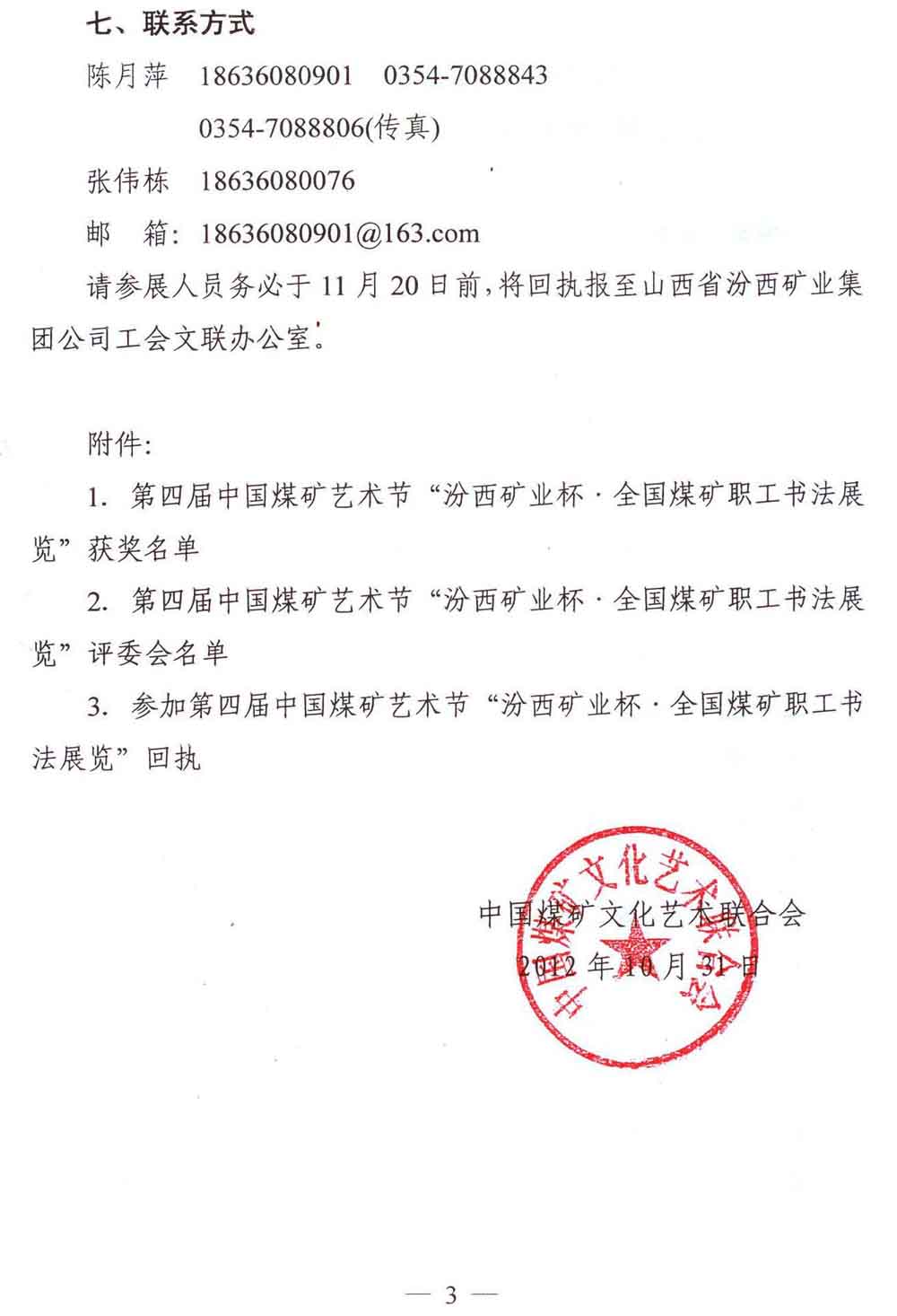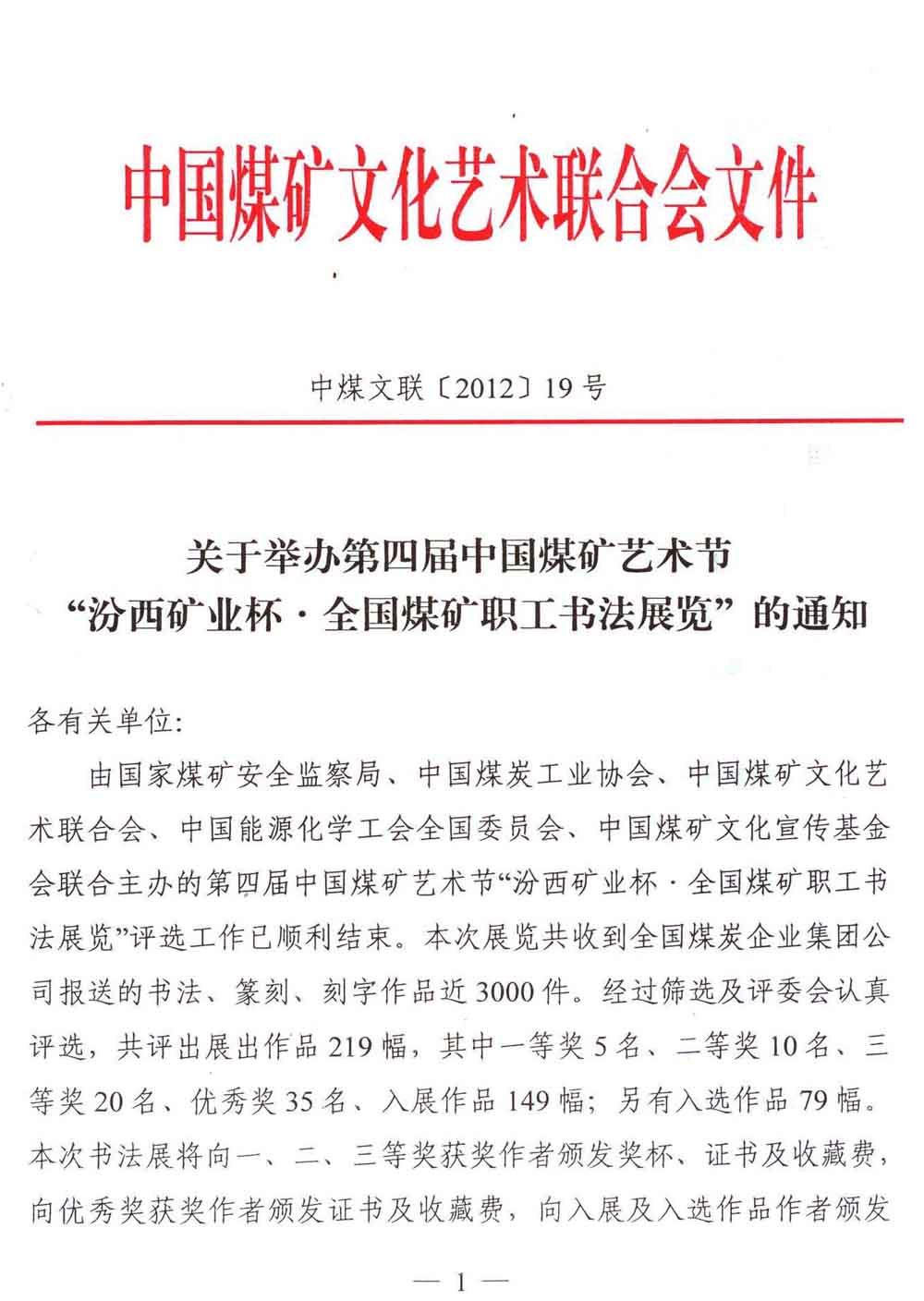 关于举办第四届中国煤矿艺术节“汾西矿业杯全国煤矿职工书法展览”的通知 来源:中国煤矿文化网 作者:煤矿文联 时间:2012-11-07 【字体:小 大】 附件: 1.第四届中国煤矿艺术节汾西矿业杯全国煤矿职工书法展览获奖名单 2.第四届中国煤矿艺术节汾西矿业杯全国煤矿职工书法展览评委会名单 3.参加第四届中国煤矿艺术节汾西矿业杯全国煤矿职工书法展览回执 分享到: 【打印正文】