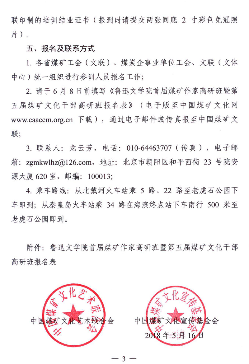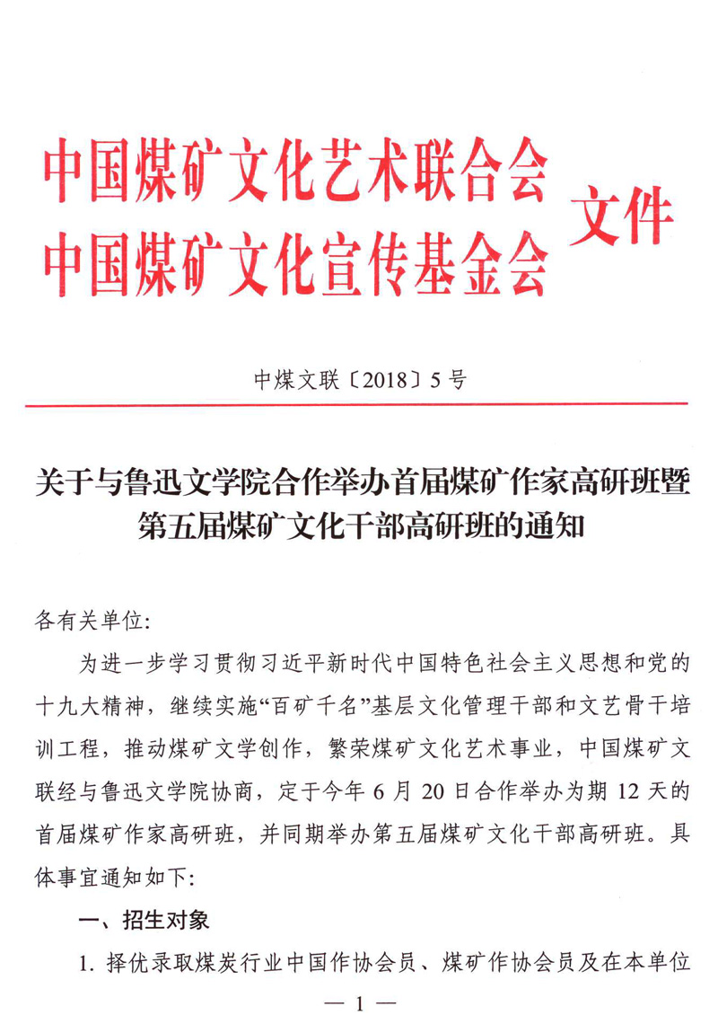 关于与鲁迅文学院合作举办首届煤矿作家高研班暨第五届煤矿文化干部高研班的通知 来源:中国煤矿文联 作者: 时间:2018-05-18 【字体:小 大】 附件:鲁迅文学院首届煤矿作家高研班暨第五届煤矿文化干部高研班报名表 智能标签: 中国煤矿文联 相关内容 分享到: 【打印正文】