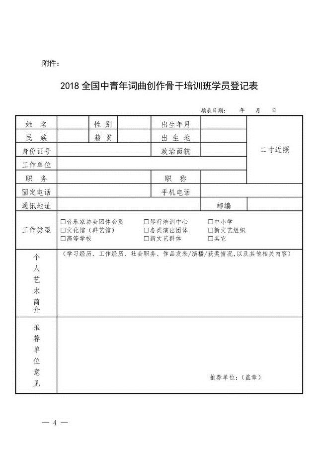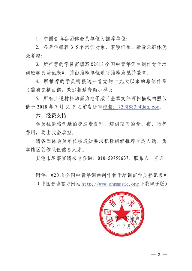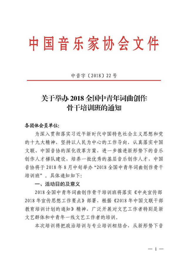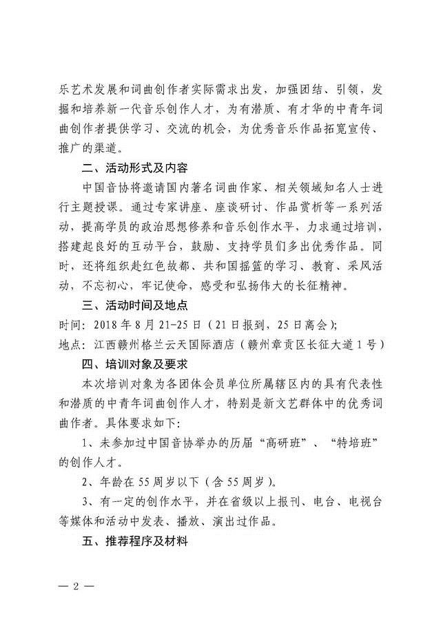 中国音协:关于举办2018全国中青年词曲创作骨干培训班的通知 来源:中国音协 作者: 时间:2018-07-24 【字体:小 大】 附件1下载:关于举办2018全国中青年词曲创作骨干培训班的通知pdf版附件2下载:《2018全国中青年词曲创作骨干培训班学员登记表》word版 智能标签: 中国音协 相关内容 分享到: 【打印正文】