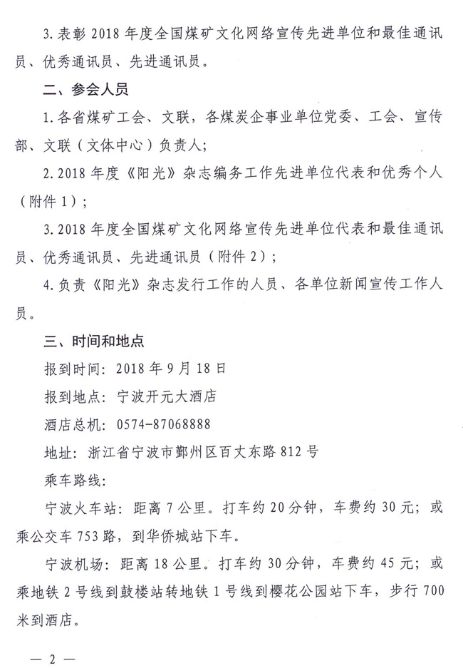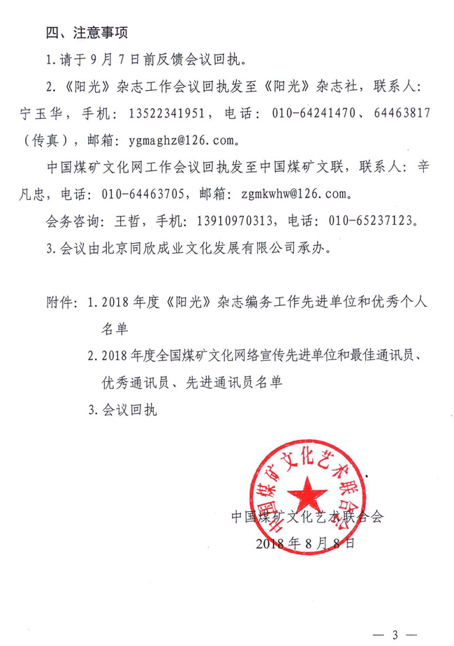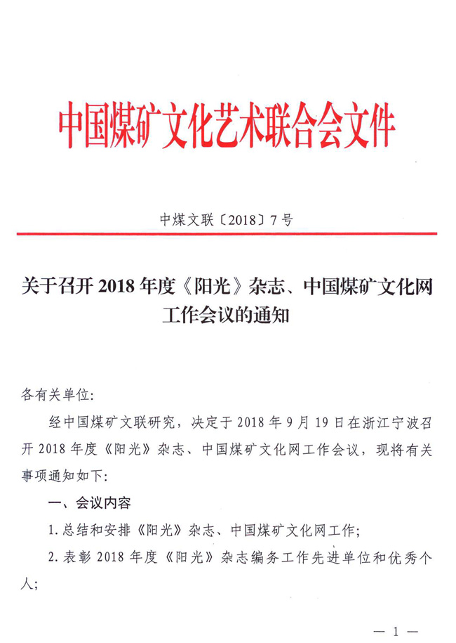 关于召开2018年度《阳光》杂志、中国煤矿文化网工作会议的通知 来源:中国煤矿文联 作者: 时间:2018-08-17 【字体:小 大】 附件:1.2018年度《阳光》杂志编务工作先进单位和优秀个人名单2.2018年度全国煤矿文化网络宣传先进单位和最佳通讯员、优秀通讯员、先进通讯员名单3.会议回执 智能标签: 中国煤矿文联 相关内容 分享到: 【打印正文】