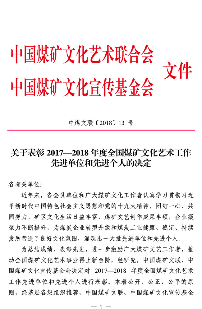 关于表彰2017—2018年度全国煤矿文化艺术工作先进单位和先进个人的决定 来源:中国煤矿文联 作者: 时间:2018-12-15 【字体:小 大】 关于表彰2017—2018年度全国煤矿文化艺术工作先进单位和先进个人的决定(PDF版) 智能标签: 中国煤矿文联 相关内容 分享到: 【打印正文】