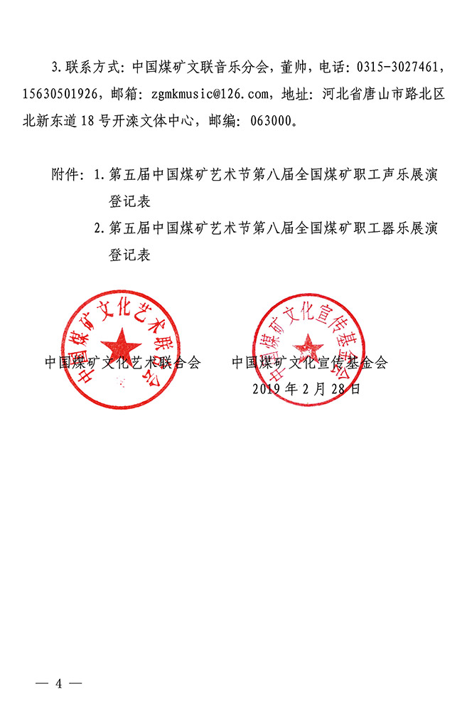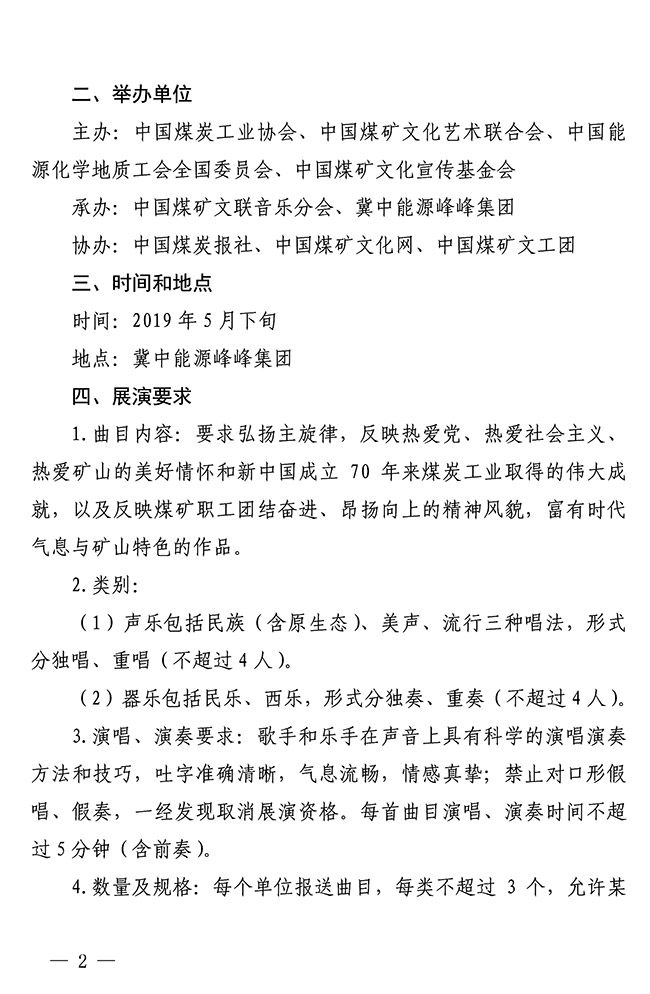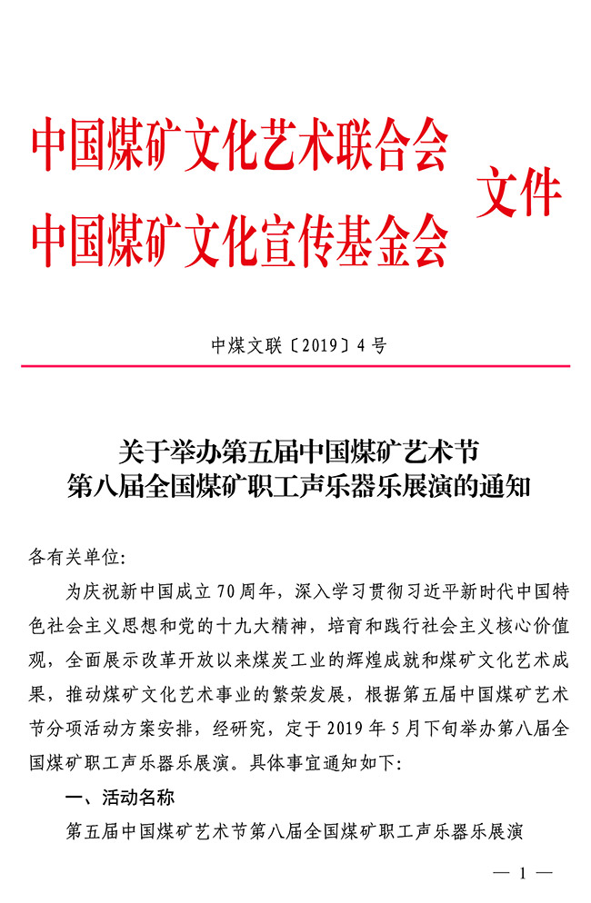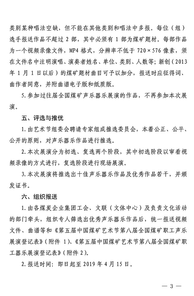 关于举办第八届全国煤矿职工声乐器乐展演的通知 来源:中国煤矿文联 作者: 时间:2019-03-11 【字体:小 大】 关于举办第五届中国煤矿艺术节第八届全国煤矿职工声乐器乐展演的通知(PDF版)附件:1.第五届中国煤矿艺术节第八届全国煤矿职工声乐展演登记表2.第五届中国煤矿艺术节第八届全国煤矿职工器乐展演登记表 智能标签: 中国煤矿艺术节 相关内容 分享到: 【打印正文】