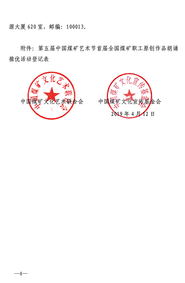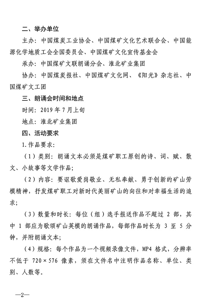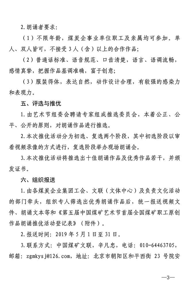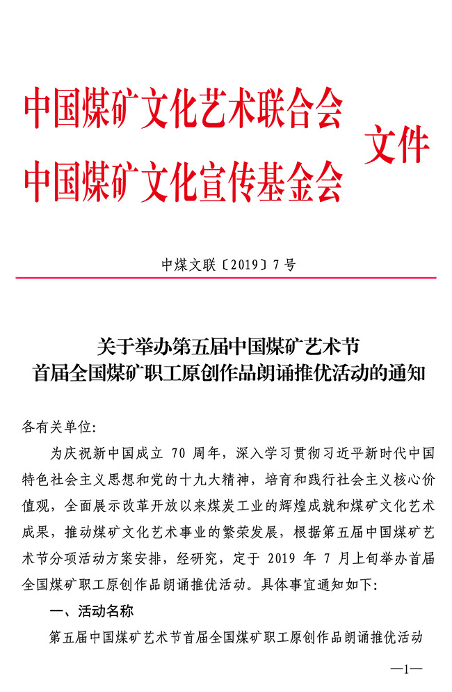 关于举办首届全国煤矿职工原创作品朗诵推优活动的通知 来源:中国煤矿文联 作者: 时间:2019-04-17 【字体:小 大】 附件:关于举办第五届中国煤矿艺术节首届全国煤矿职工原创作品朗诵推优活动的通知(PDF版)第五届中国煤矿艺术节首届全国煤矿职工原创作品朗诵推优活动登记表 智能标签: 中国煤矿文联 相关内容 分享到: 【打印正文】