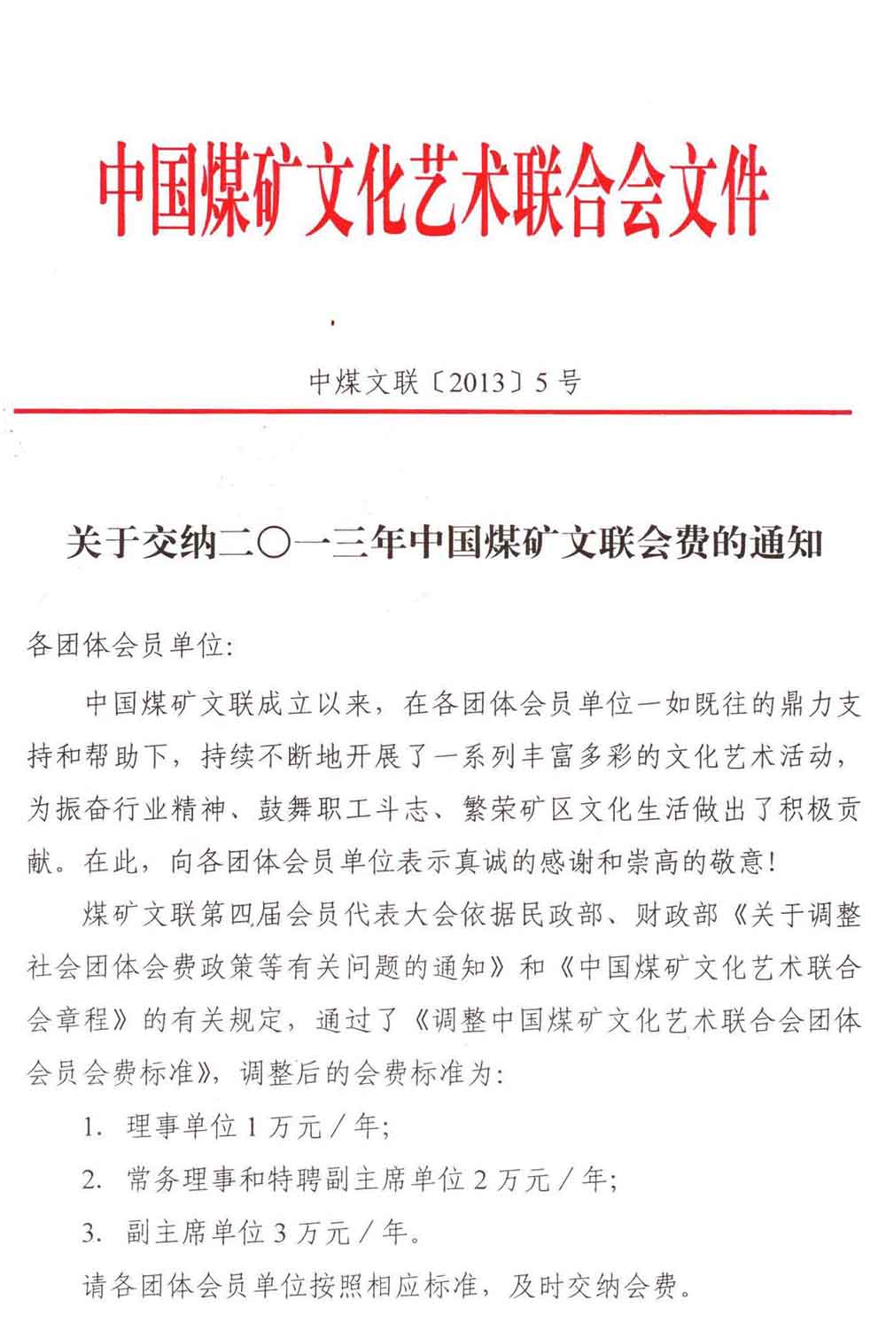关于交纳二〇一三年中国煤矿文联会费的通知