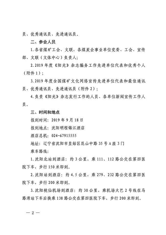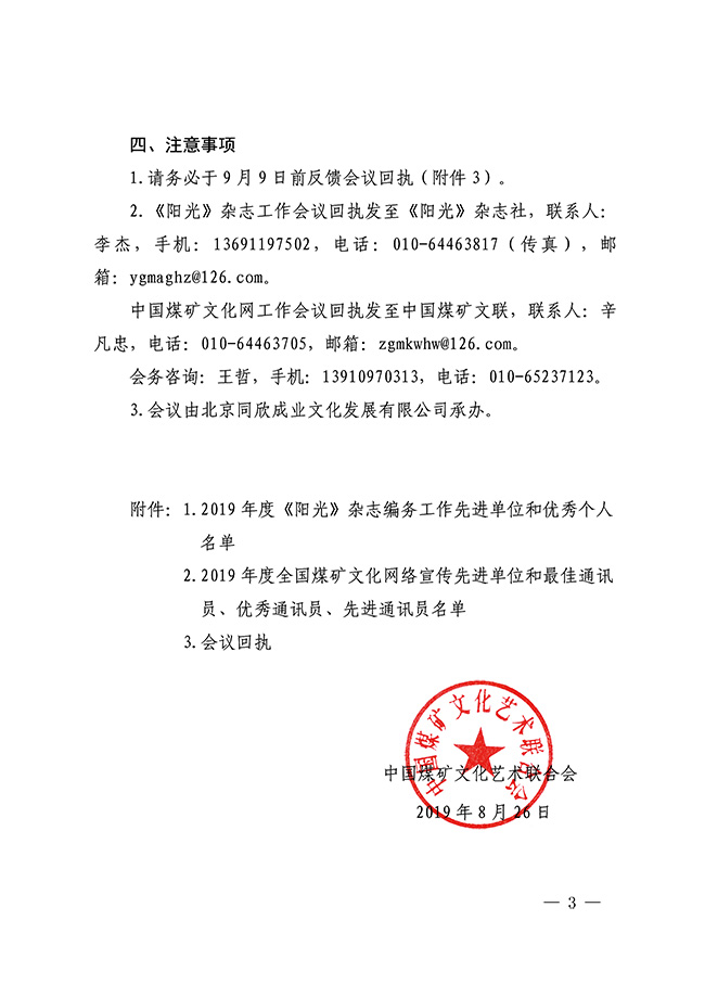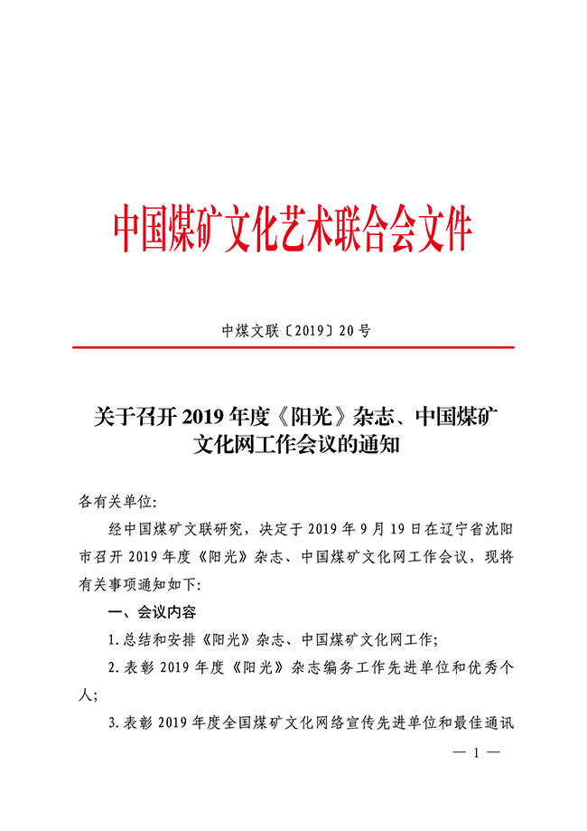 关于召开2019年度《阳光》杂志、中国煤矿文化网工作会议的通知 来源:中国煤矿文联 作者: 时间:2019-09-02 【字体:小 大】 附件:· 关于召开2019年度《阳光》杂志、中国煤矿文化网工作会议的通知(PDF版,含附件1-2)· 会议回执(附件3) 智能标签: 中国煤矿文联 相关内容 分享到: 【打印正文】