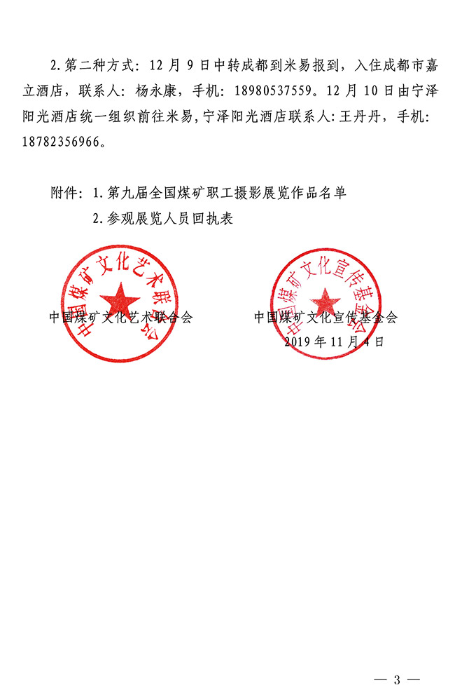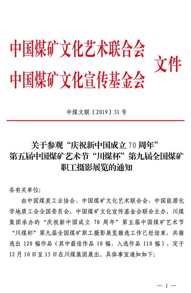 关于参观“川煤杯”第九届全国煤矿职工摄影展览的通知 来源:中国煤矿文联 作者: 时间:2019-11-18 【字体:小 大】 附件:关于参观“庆祝新中国成立70周年”第五届中国煤矿艺术节“川煤杯”第九届全国煤矿职工摄影展览的通知(PDF版,含附件1)参观展览人员回执表 智能标签: 中国煤矿文联 中国煤矿艺术节 相关内容 分享到: 【打印正文】