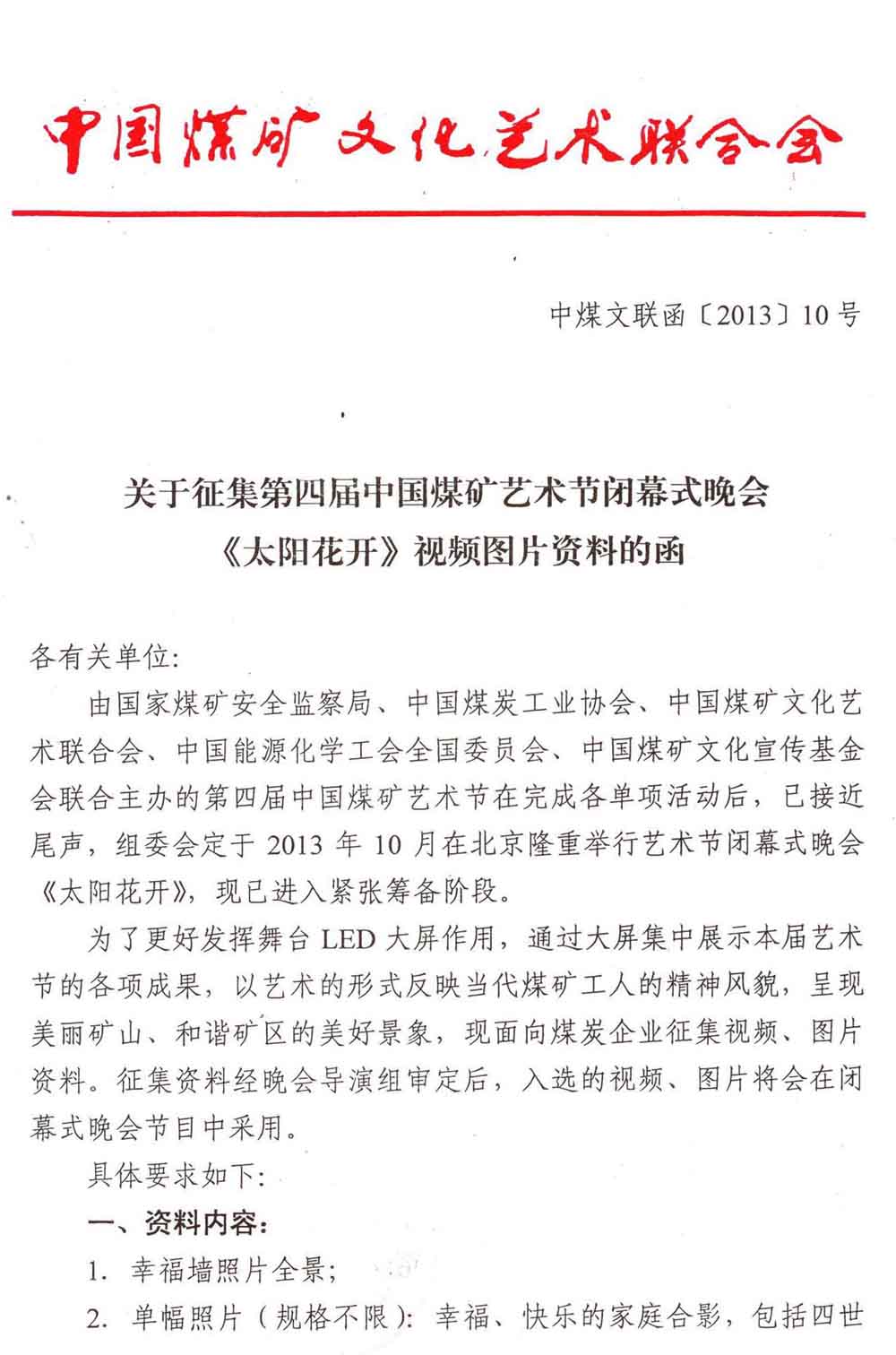 关于征集第四届中国煤矿艺术节闭幕式晚会《太阳花开》视频图片资料的函