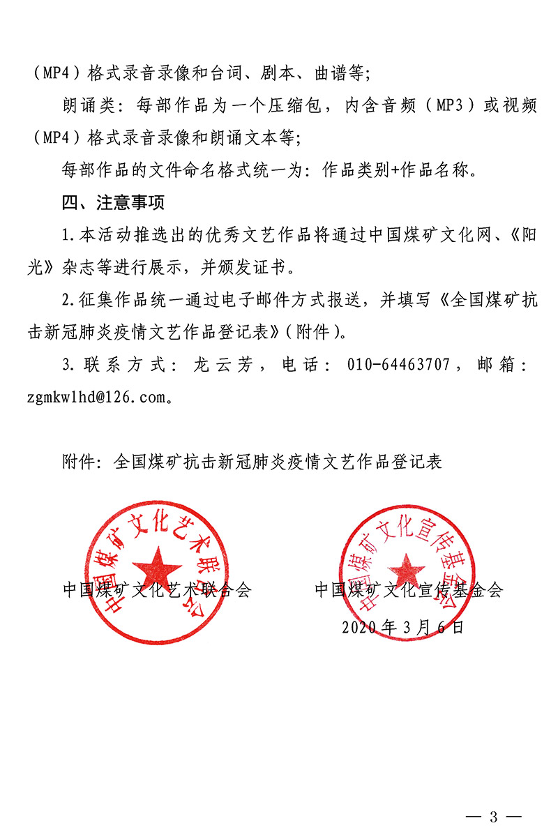 关于开展全国煤矿抗击新冠肺炎疫情文艺作品征集推选活动的通知 来源:中国煤矿文联 作者: 时间:2020-03-11 【字体:小 大】 附件:关于开展全国煤矿抗击新冠肺炎疫情文艺作品征集推选活动的通知(PDF版)全国煤矿抗击新冠肺炎疫情文艺作品登记表 智能标签: 中国煤矿文联 相关内容 分享到: 【打印正文】
