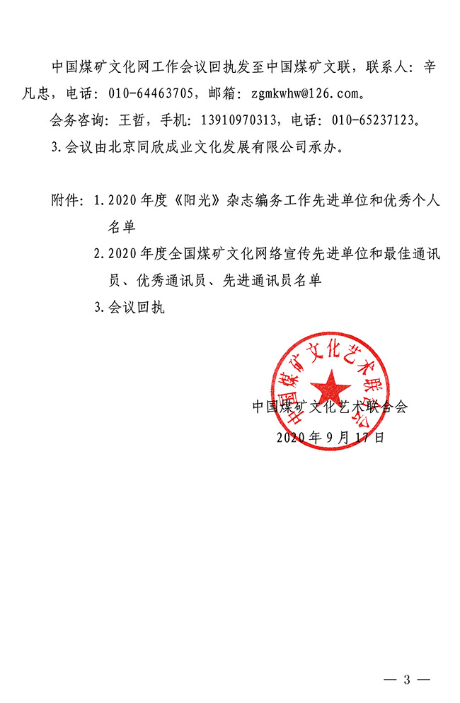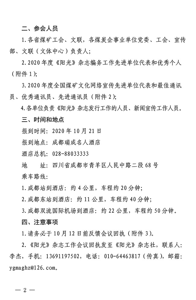 关于召开2020年度《阳光》杂志、中国煤矿文化网工作会议的通知 来源:中国煤矿文联 作者: 时间:2020-09-21 【字体:小 大】 关于召开2020年度《阳光》杂志、中国煤矿文化网工作会议的通知(PDF版及附件1-2)附件3:会议回执 分享到: 【打印正文】