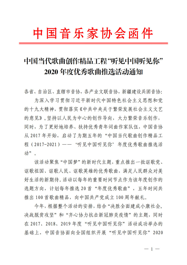 中国音协:中国当代歌曲创作精品工程“听见中国听见你”2020年度优秀歌曲推选 活动通知 来源:中国音协 作者: 时间:2020-10-12 【字体:小 大】 附件1:2020听见中国听见你方案(定版)附件2:2020听见中国听见你个人作品登记表附件3:2020听见中国听见你团体作品报送表(定版) 分享到: 【打印正文】