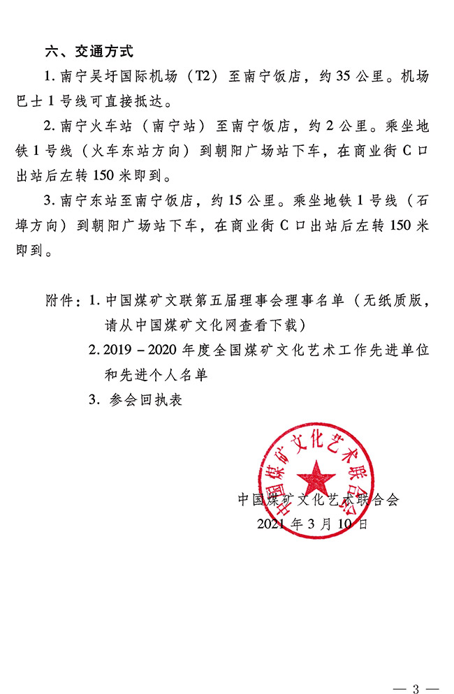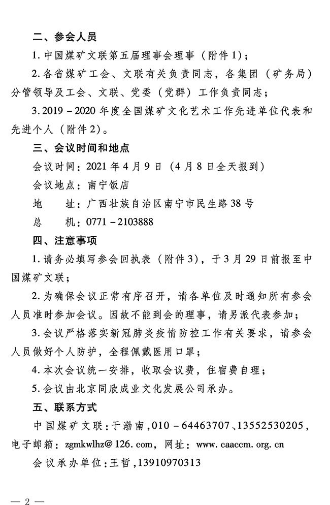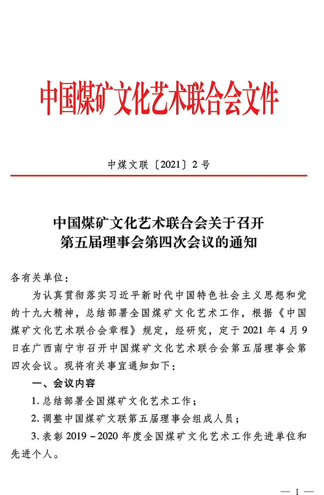 中国煤矿文联关于召开五届理事会四次会议的通知 来源:中国煤矿文联 作者: 时间:2021-03-15 【字体:小 大】 附件:中国煤矿文化艺术联合会关于召开第五届理事会第四次会议的通知(PDF版)1. 中国煤矿文联第五届理事会理事名单2. 2019—2020年度全国煤矿文化艺术工作先进单位和先进个人名单3. 参会回执表 智能标签: 中国煤矿文联 相关内容 分享到: 【打印正文】