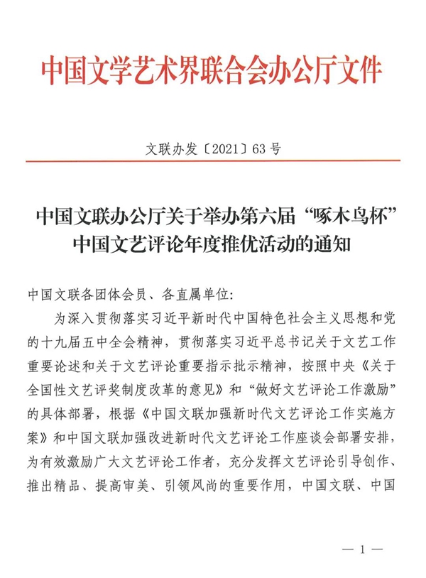 为深入贯彻落实习近平新时代中国特色社会主义思想和党的十九届五中全会精神,贯彻落实习近平总书记关于文艺工作重要论述和关于文艺评论重要指示批示精神,按照中央《关于全国性文艺评奖制度改革的意见》和“做好文艺评论工作激励”的具体部署,根据《中国文联加强新时代文艺评论工作实施方案》和中国文联加强改进新时代文艺评论工作座谈会部署安排,为有效激励广大文艺评论工作者,充分发挥文艺评论引导创作、推出精品、提高审美、引领风尚的重要作用,中国文联、中国文艺评论家协会决定举办第六届“啄木鸟杯”中国文艺评论年度推优活动。具体事项通知如下: