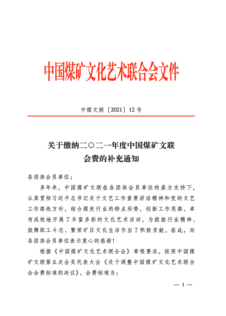 关于缴纳二○二一年度中国煤矿文联会费的补充通知