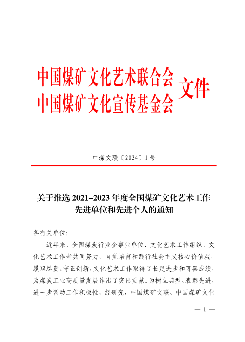 关于推选2021-2023年度全国煤矿文化艺术工作先进单位和先进个人的通知 来源:中国煤矿文联 作者: 时间:2024-01-09 【字体:小 大】 附件(2-3):2021-2023年度全国煤矿文化艺术工作先进单位推荐表2021-2023年度全国煤矿文化艺术工作先进个人推荐表 分享到: 【打印正文】