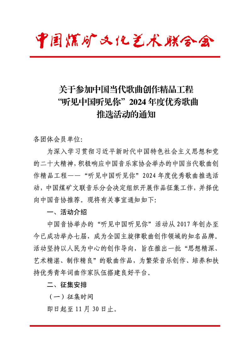 关于参加中国当代歌曲创作精品工程“听见中国听见你”2024年度优秀歌曲推选活动的通知 来源:中国煤矿文联 作者: 时间:2024-11-06 【字体:小 大】 附件1-2:《作品登记表》《作品授权书》 分享到: 【打印正文】