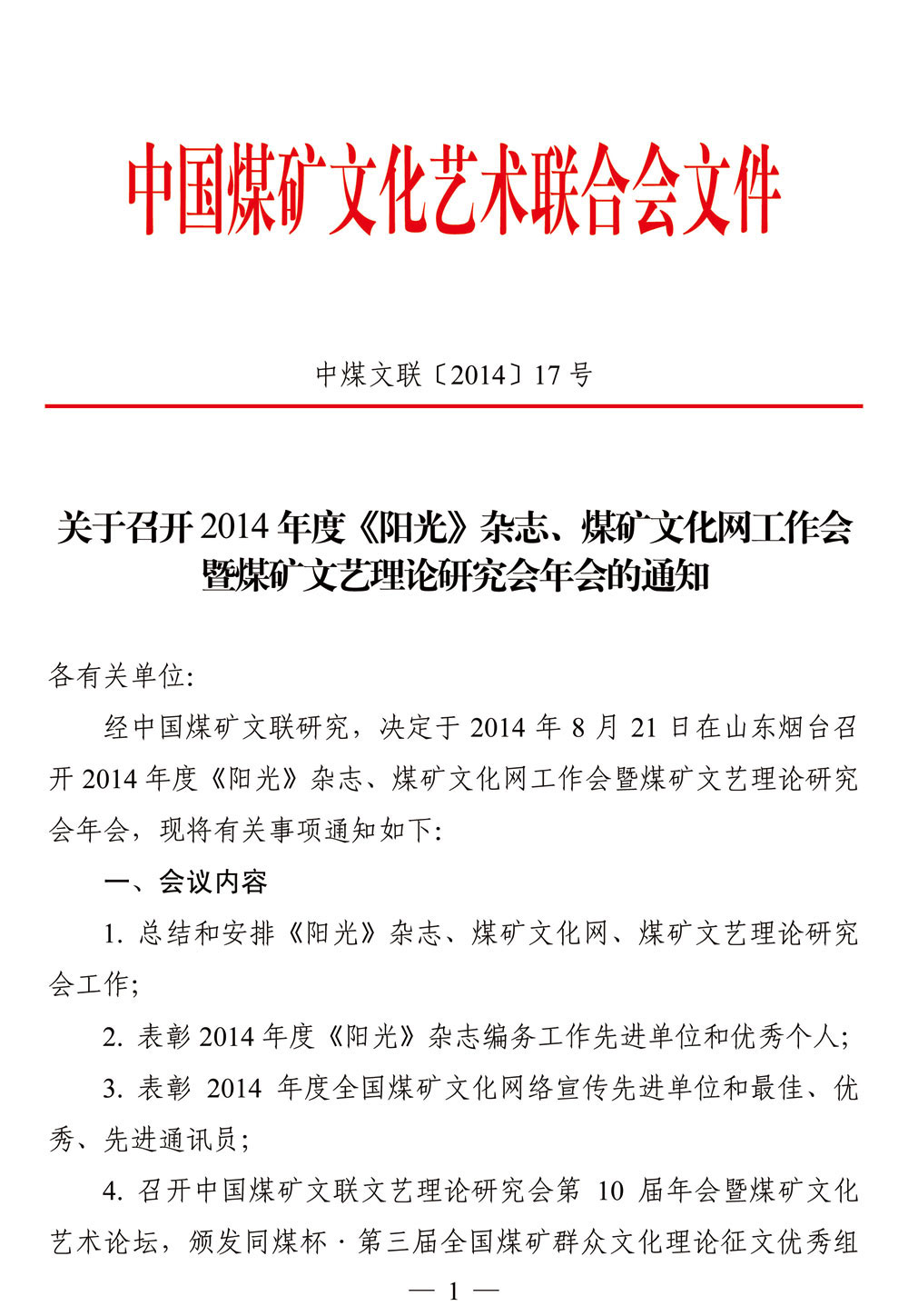 关于召开2014年度《阳光》杂志、煤矿文化网工作会暨煤矿文艺理论研究会年会的通知 来源:中国煤矿文联 作者: 时间:2014-07-31 【字体:小 大】 附件: 1. 2014年度《阳光》杂志编务工作先进单位和优秀个人名单 2. 2014年度全国煤矿文化网络宣传先进单位和最佳通讯员、优秀通讯员、先进通讯员名单 3. 同煤杯·第三届全国煤矿群众文化理论征文活动优秀组织奖和优秀论文名单 4. 参加会议人员回执 分享到: 【打印正文】