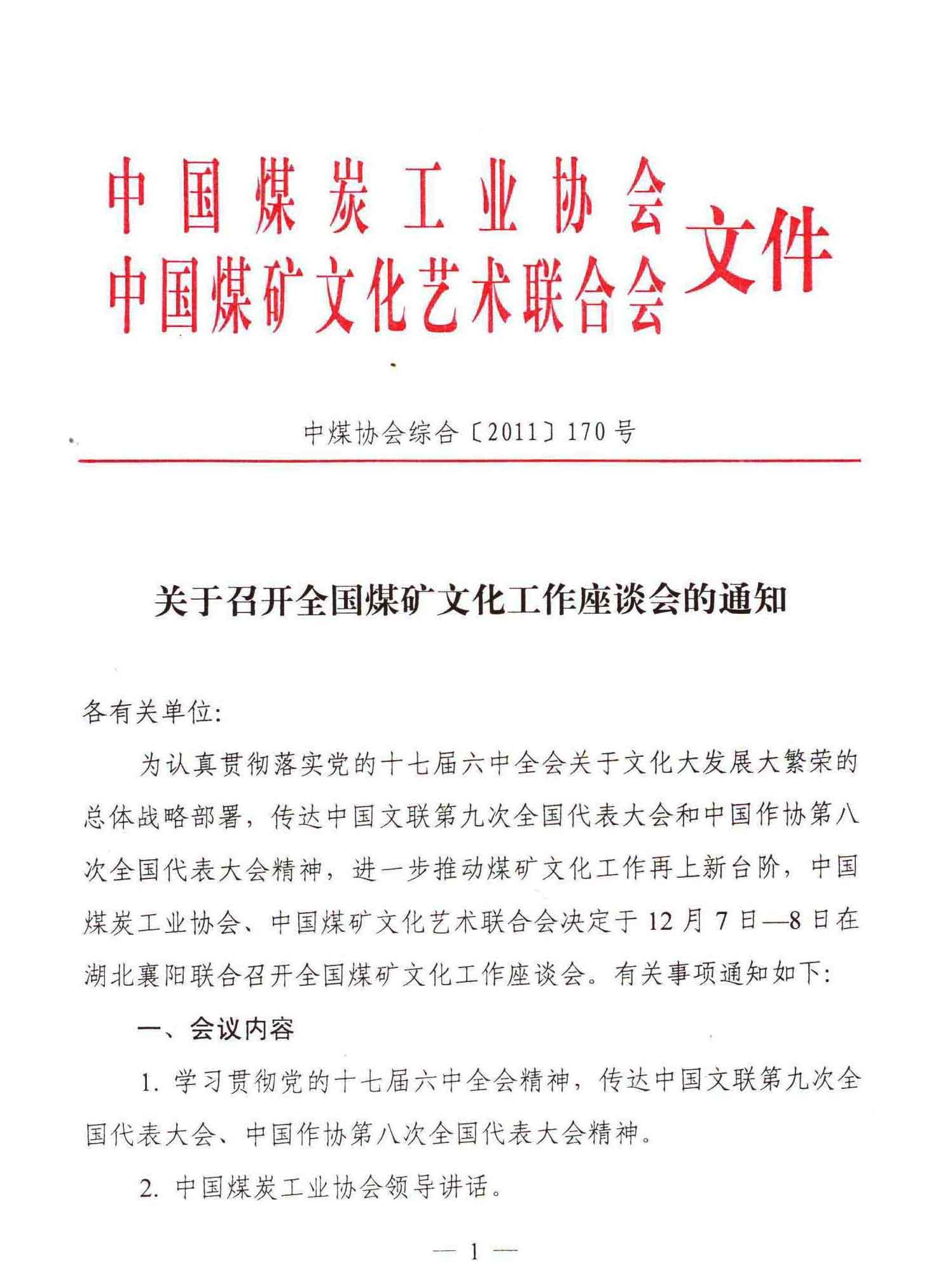 关于召开全国煤矿文化工作座谈会的通知 来源:中国煤矿文化网 作者:煤矿文联 时间:2011-11-15 【字体:小 大】 附件1:中国煤矿文联第三届理事会理事名单 附件2:参加全国煤矿文化工作座谈会回执 分享到: 【打印正文】