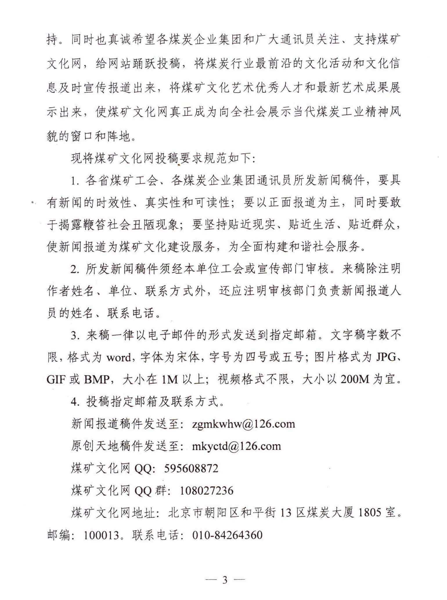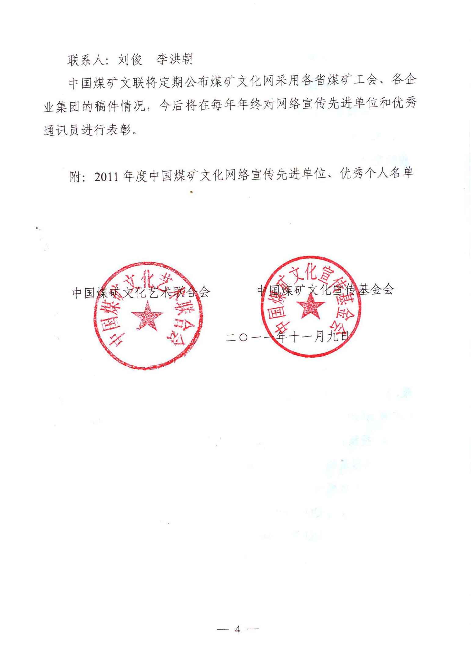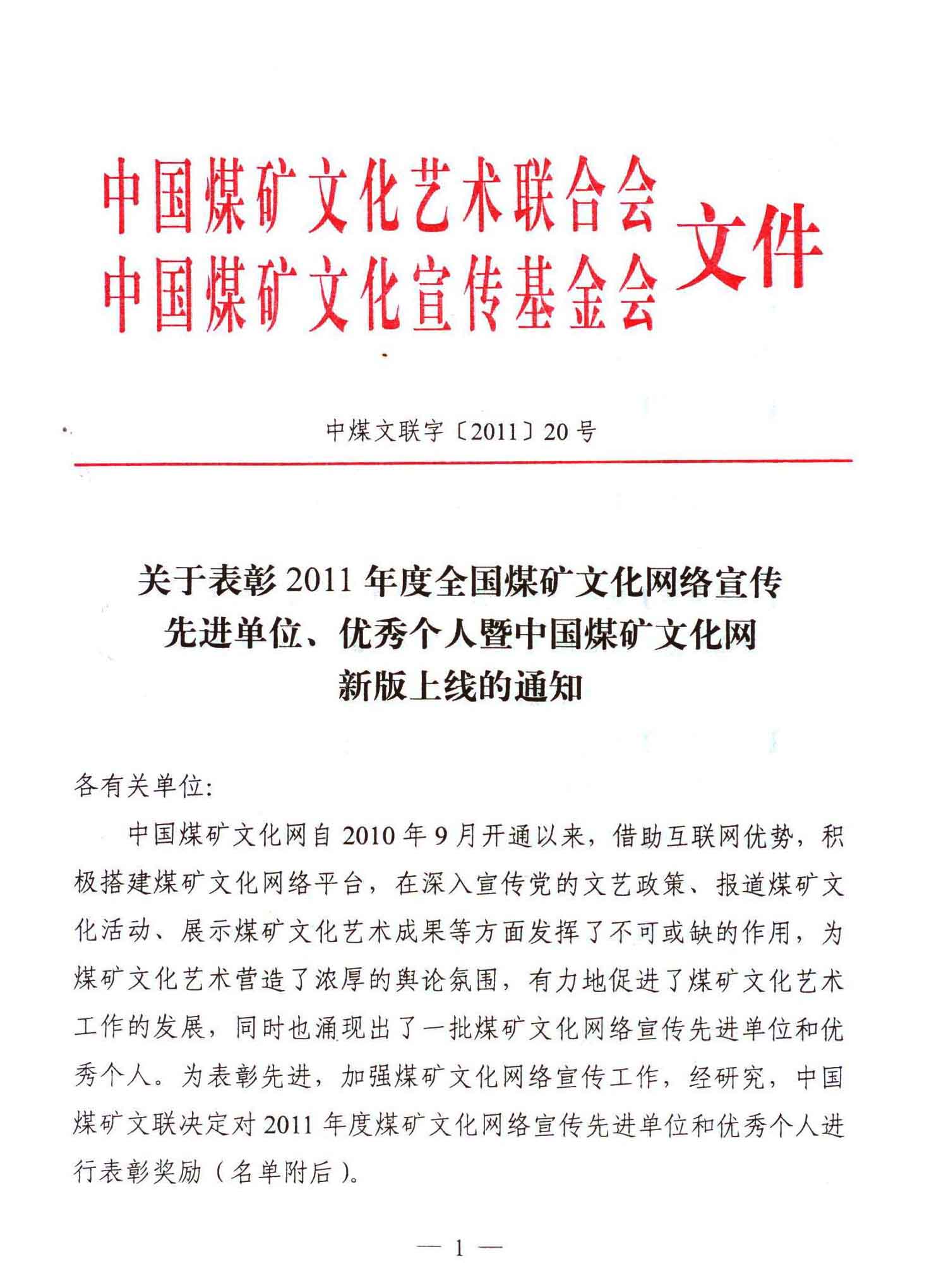 关于表彰2011年度全国煤矿文化网络宣传先进单位、优秀个人暨中国煤矿文化网新版上线的通知 来源:中国煤矿文化网 作者:煤矿文联 时间:2011-11-15 【字体:小 大】 附:2011年度中国煤矿文化网络宣传先进单位、优秀个人名单 分享到: 【打印正文】