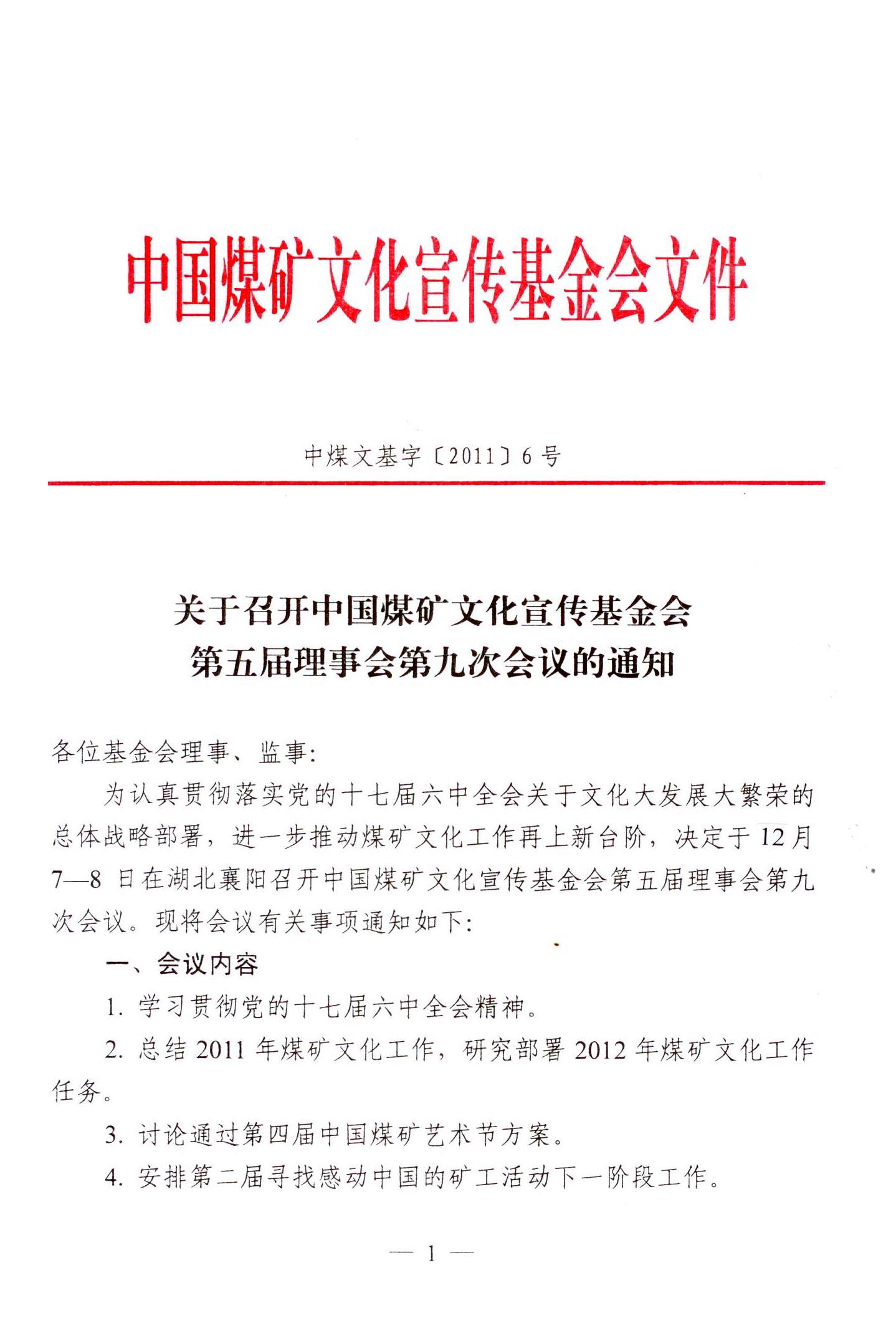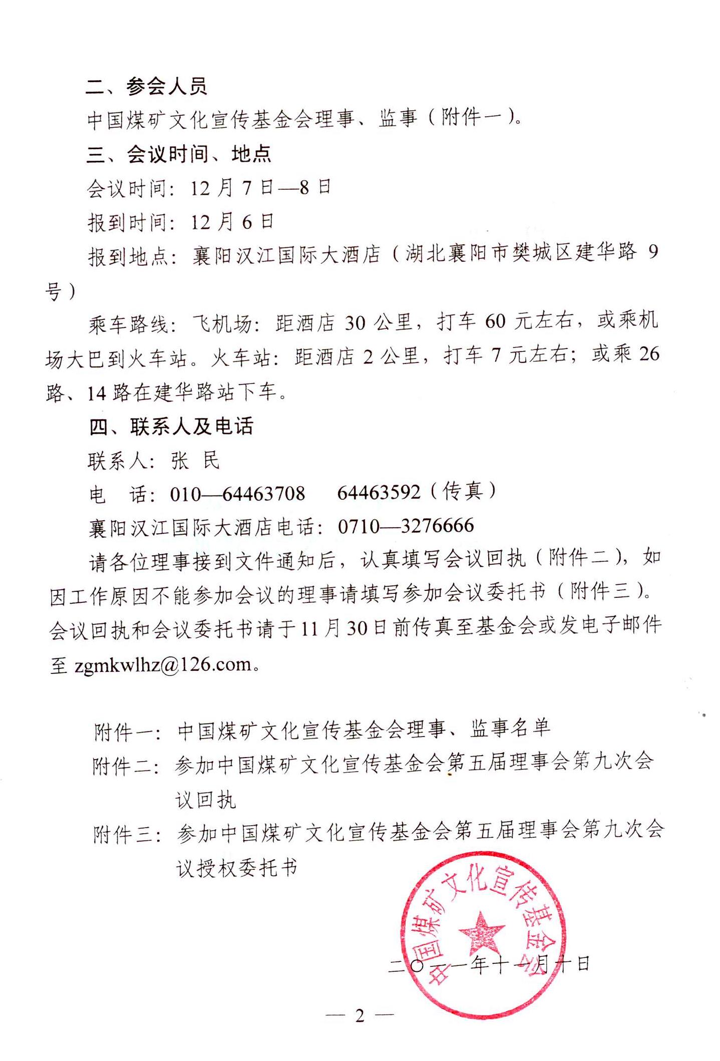 关于召开中国煤矿文化宣传基金会第五届理事会第九次会议的通知 来源:中国煤矿文化网 作者:煤矿文联 时间:2011-11-18 【字体:小 大】 附件一:中国煤矿文化宣传基金会理事、监事名单 附件二:参加中国煤矿文化宣传基金会第五届理事会第九次会议回执 附件三:参加中国煤矿文化宣传基金会第五届理事会第九次会议授权委托书 分享到: 【打印正文】
