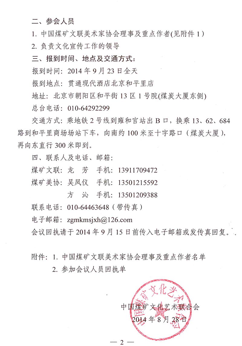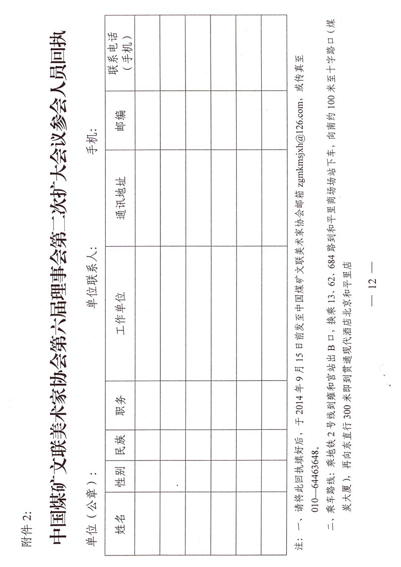 关于召开中国煤矿文联美术家协会第六届理事会第二次扩大会议的通知 来源:中国煤矿文联 作者: 时间:2014-08-29 【字体:小 大】 附件:1. 中国煤矿文联美术家协会理事及重点作者名单 2. 参加会议人员回执 分享到: 【打印正文】