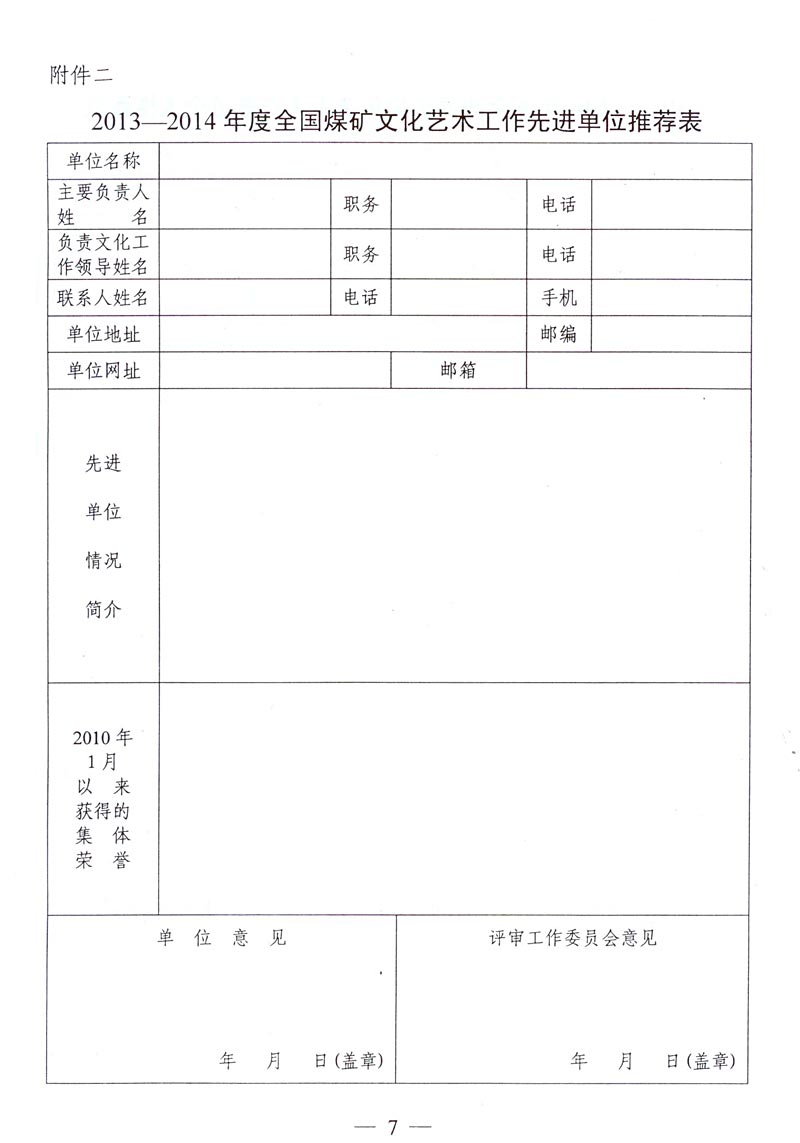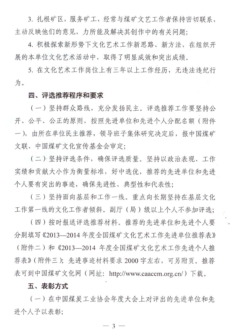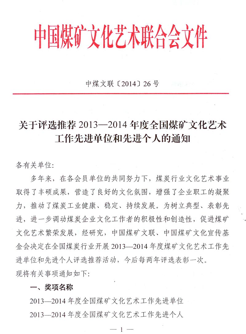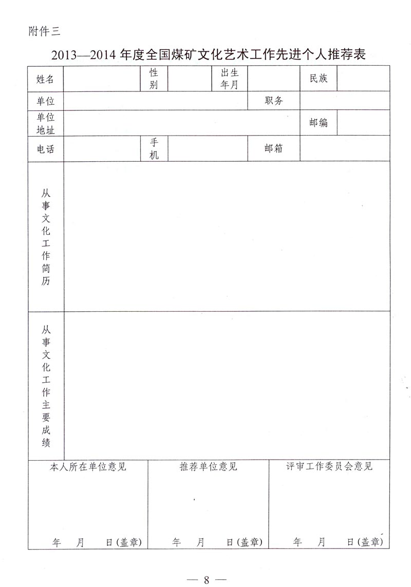 关于评选推荐2013—2014年度全国煤矿文化艺术工作先进单位和先进个人的通知 来源: 作者: 时间:2014-11-21 【字体:小 大】 附件下载: 附件一:2013—2014年度全国煤矿文化艺术工作先进单位和先进个人名额分配表 附件二:2013—2014年度全国煤矿文化艺术工作先进单位推荐表 附件三:2013—2014年度全国煤矿文化艺术工作先进个人推荐表 智能标签: 全国煤矿 文化艺术工作 先进单位 先进个人 相关内容 分享到: 【打印正文】