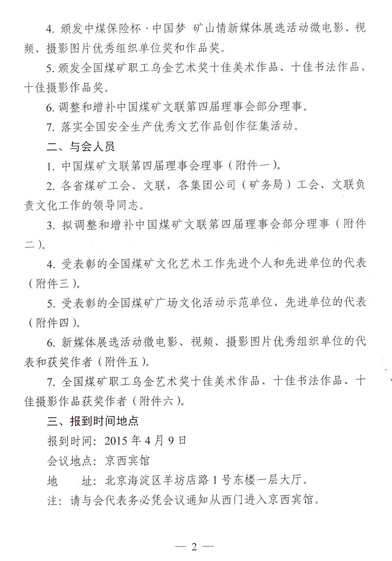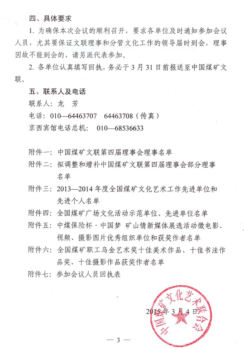 关于召开全国煤矿文化艺术工作先进单位、 先进个人表彰大会暨中国煤矿文联第四届理事会第五次会议的通知 来源: 作者: 时间:2015-03-19 【字体:小 大】 附件一:中国煤矿文联第四届理事会理事名单 附件二:拟调整和增补中国煤矿文联第四届理事会部分理事名单 附件三:2013—2014年度全国煤矿文化艺术工作先进单位和先进个人名单 附件四:全国煤矿广场文化活动示范单位、先进单位名单 附件五:中煤保险杯·中国梦 矿山情新媒体展选活动微电影、视频、摄影图片优秀组织单位和获奖作者名单 附件六:全国煤矿职工乌金艺术奖十佳美术作品、十佳书法作品奖、十佳摄影作品获奖作者名单 附件七:参加会议人员回执表 智能标签: 煤矿文化艺术 先进单位 先进个人 中国煤矿文联 理事会 相关内容 分享到: 【打印正文】