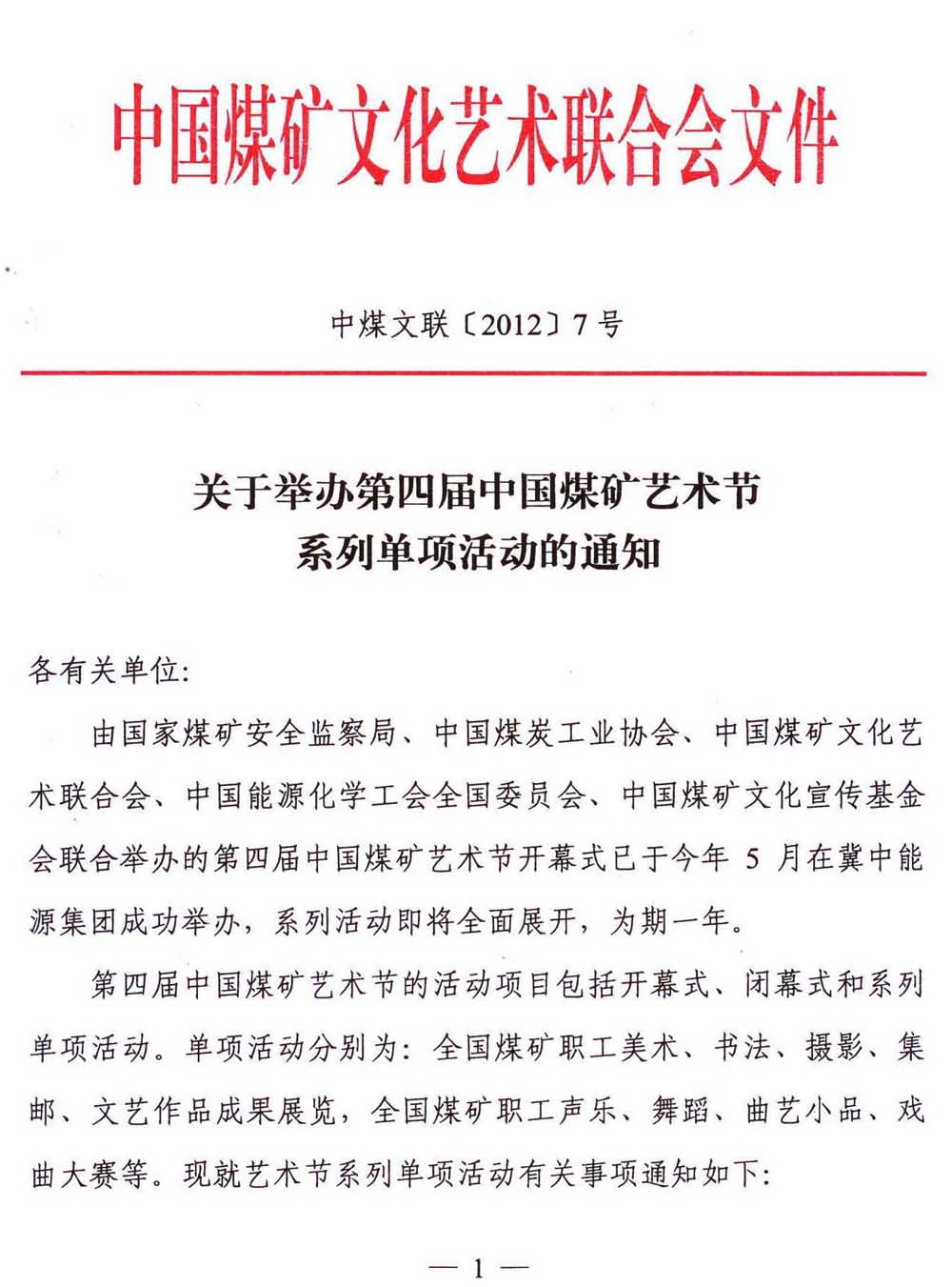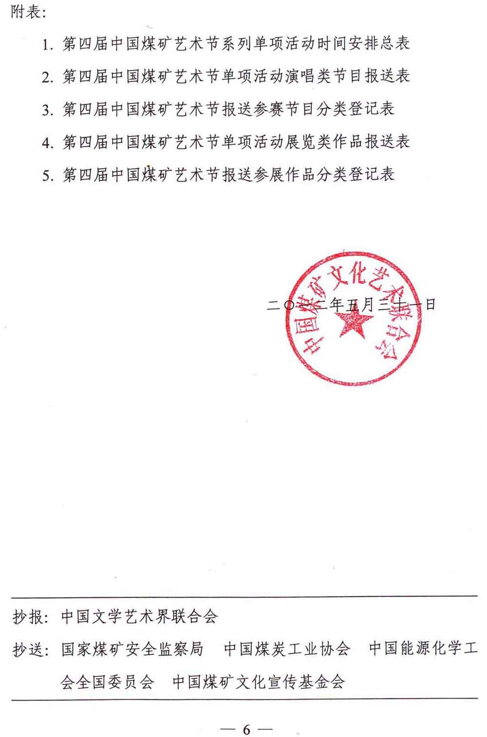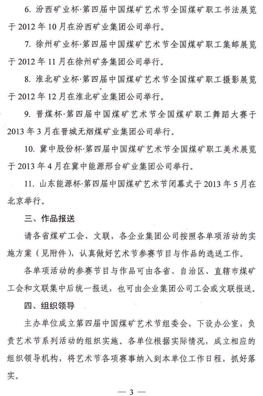 关于举办第四届中国煤矿艺术节系列单项活动的通知 来源:中国煤矿文化网 作者: 时间:2012-06-02 【字体:小 大】 附件:第四届中国煤矿艺术节组委会名单、系列单项活动方案及报送表 分享到: 【打印正文】