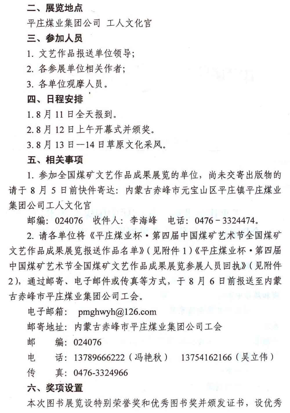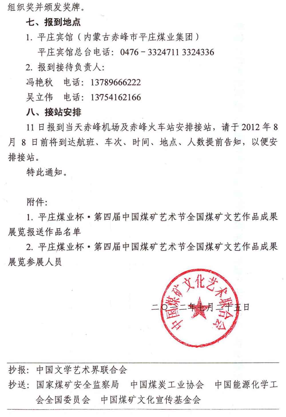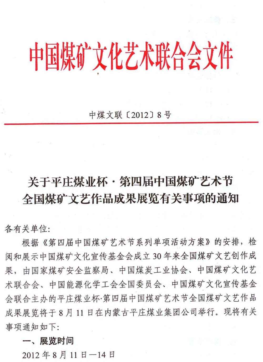 关于平庄煤业杯·第四届中国煤矿艺术节全国煤矿文艺作品成果展览有关事项的通知 来源:中国煤矿文化网 作者: 时间:2012-07-27 【字体:小 大】 附件:平庄煤业杯·第四届中国煤矿艺术节全国煤矿文艺作品成果展览报送作品名单及参展人员回执 分享到: 【打印正文】