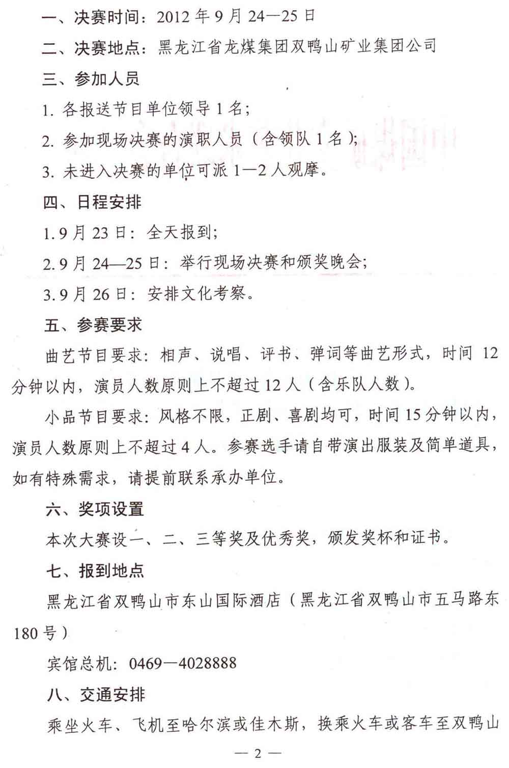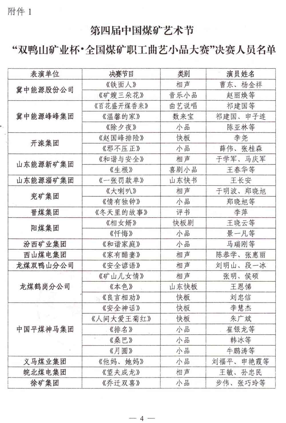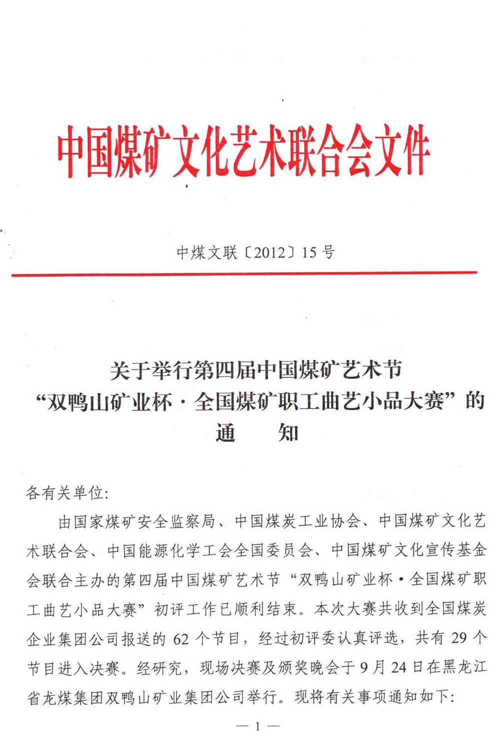 关于举行第四届中国煤矿艺术节“双鸭山矿业杯·全国煤矿职工曲艺小品大赛”的通知 来源:中国煤矿文化网 作者: 时间:2012-09-07 【字体:小 大】 附件:参加第四届中国煤矿艺术节双鸭山矿业杯全国煤矿职工曲艺小品大赛回执 分享到: 【打印正文】