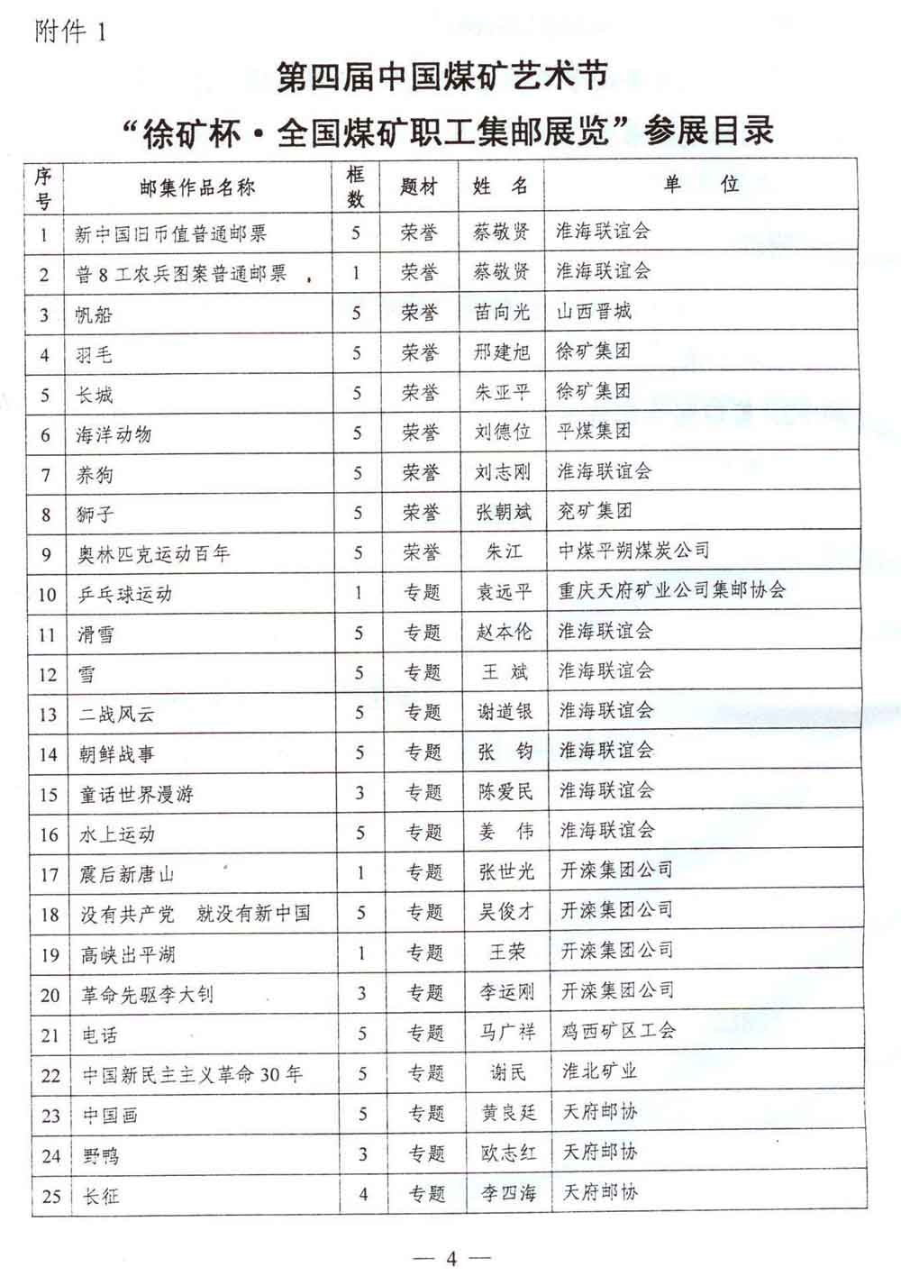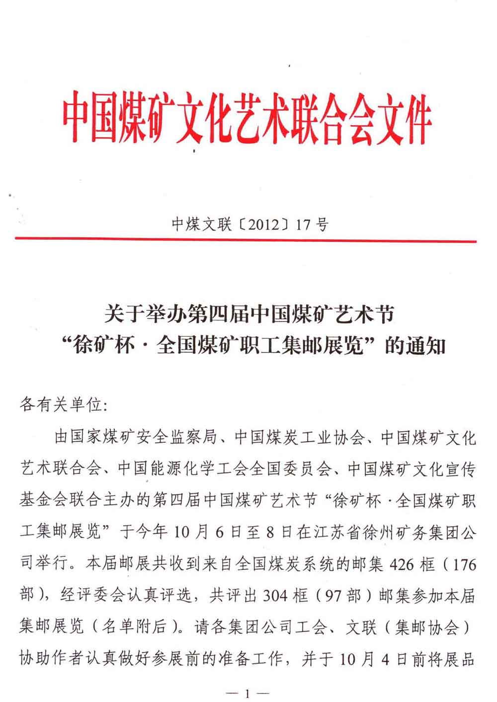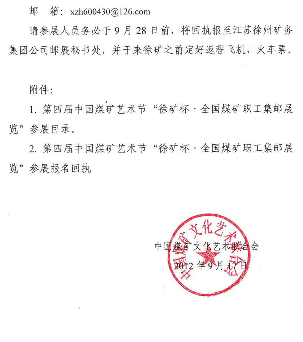 关于举办第四届中国煤矿艺术节“徐矿杯·全国煤矿职工集邮展览”的通知 来源:中国煤矿文化网 作者: 时间:2012-09-18 【字体:小 大】 附件2:第四届中国煤矿艺术节徐矿杯全国煤矿职工集邮展览参展报名回执 分享到: 【打印正文】