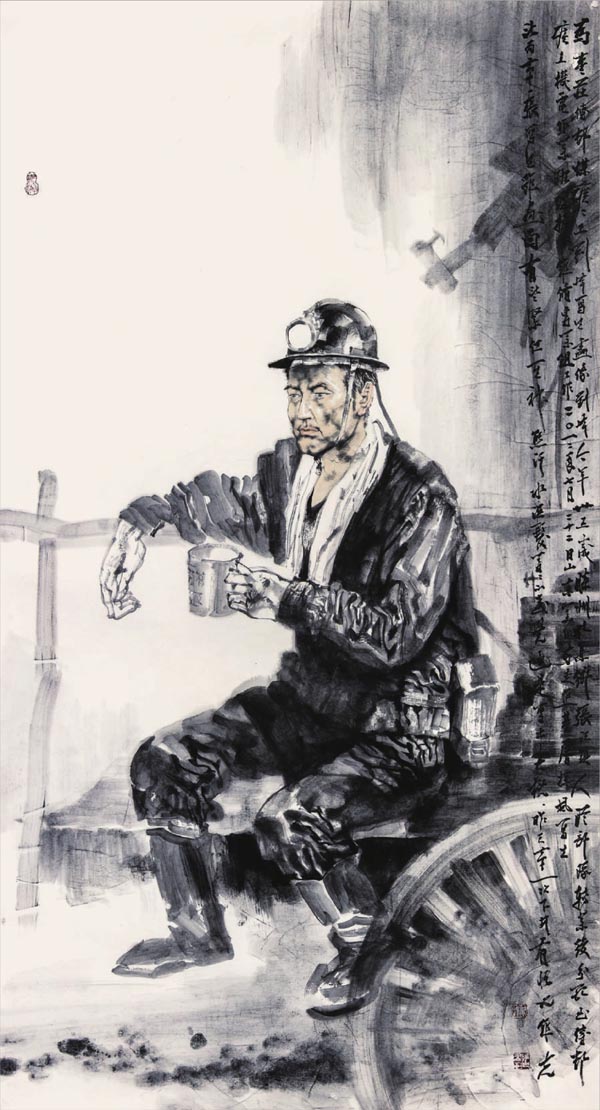 我自大学毕业后30年来少有机会对着人物直接画写生。去年3月,为了为农民工塑像全国中国画展的约稿及5月为清华大学水墨人物画研修班上课,开始重新拾起水墨人物写生。回想起当年在学生时代画模特的情景,那是有些为赋新词强说愁的感觉,是找了些道具为模特化装、生硬地摆各种动作。而这两次为农民工和矿工写生则是在生活中直接掘取鲜活的人物,表现他们历尽沧桑的形象及生活瞬间,他们给我的视觉冲击力与化妆模特是不一样的。每每下笔都充满了激情,笔下的人物当然也就生动传神,落墨时往往想到的不是对比、塑造等已有的技法概念,而是如何用画笔去贴近那些血肉之躯;用线时想到的也不是勾描那些形体,而是如何捕捉那些生动的瞬间。在用画笔与那些鲜活形象的对话中常常不自觉地触发出阵阵激情,同时每一笔下去也往往会遗憾自己的笔拙功差,不能尽如人意地表现出预想的效果,好在形象的生动总能再启发灵感的笔笔生发,又往往会将错就错地再涂抹出另类的、出其不意的效果。