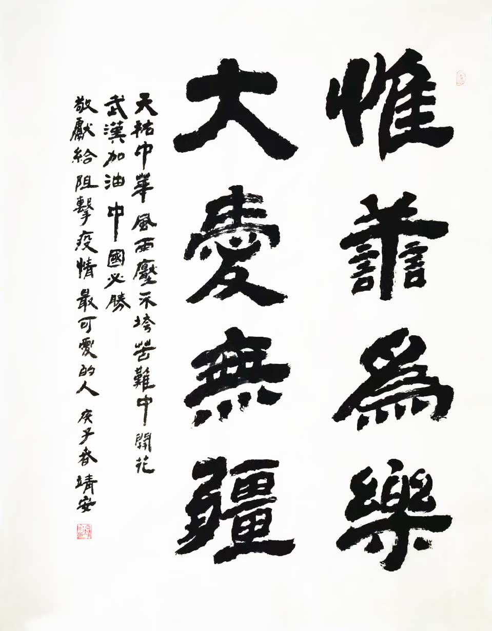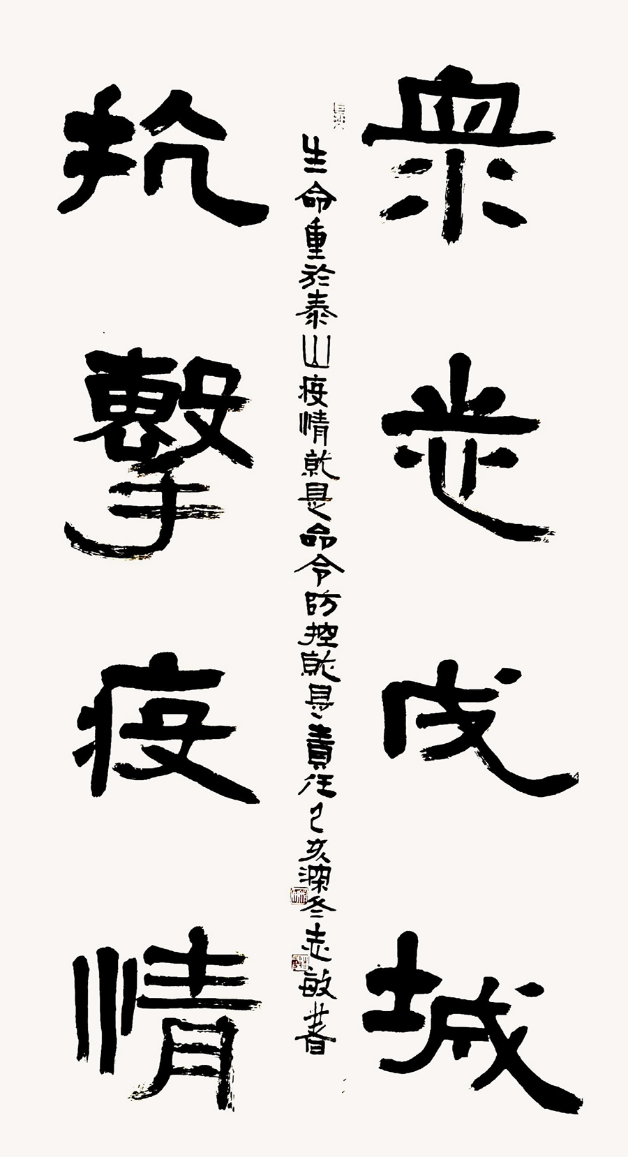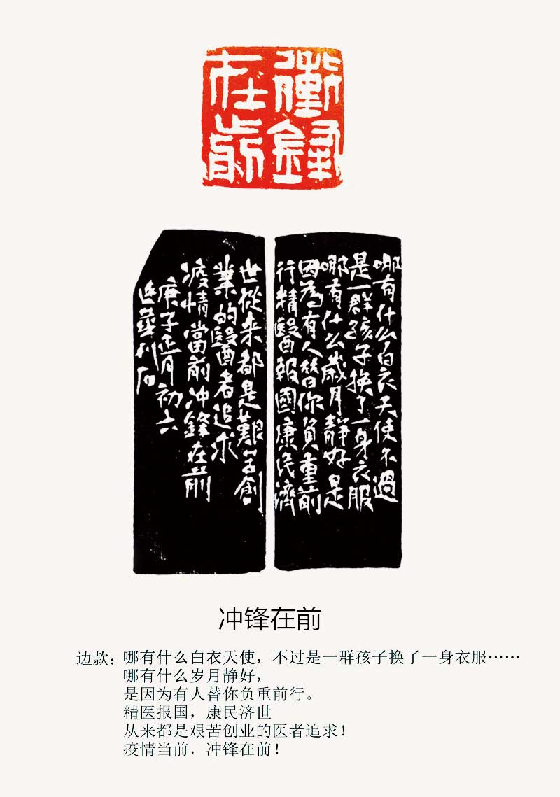 庚子新春,一场来势汹汹的新型冠状病毒感染的肺炎疫情在全国蔓延。面对疫情,习近平总书记作出重要指示,要求“广泛动员群众、组织群众、凝聚群众。紧紧依靠人民群众坚决打赢疫情防控阻击战”。在武汉、在全国各地,无数奔赴在疫情一线的工作人员同舟共济、众志成城,冒着各种风险坚守岗位,投身于这场必须打赢的疫情防控狙击战。在这场抗击疫情的战斗中,文艺工作者不能缺席。中国煤矿文联迅速组织全行业文艺工作者积极行动起来,为坚决遏制疫情蔓延势头、打赢疫情防控阻击战鼓与呼,创作出一大批各种形式的文艺作品,鼓舞全民士气,致敬白衣天使,慰问病患同胞,传递人间真情,弘扬社会正能量。中国煤矿书法家协会迅速行动起来,组织煤矿书法家,用心研墨,以爱为纸,将自己的创作激情,化作了对疫情的关切之情,两天时间创作了数百件鼓舞士气,振奋精神的书法、篆刻作品。点画间传达了550万煤矿工人声援武汉,抗击疫情的信心和决心,表达了对江城武汉的祈福、对伟大祖国的祝愿。