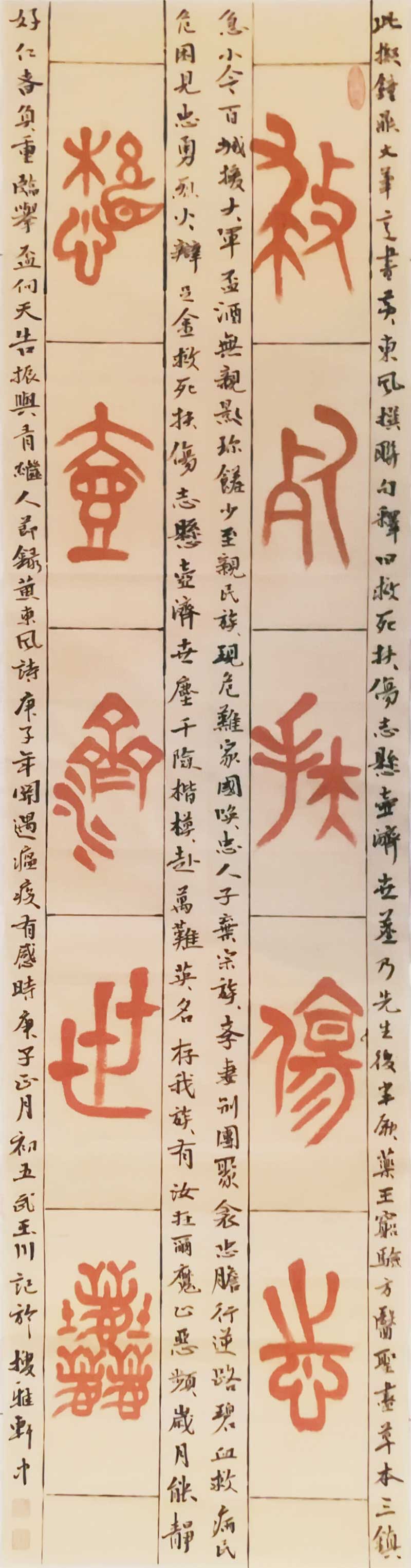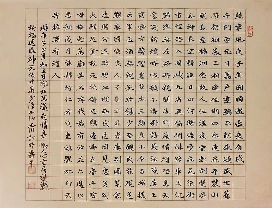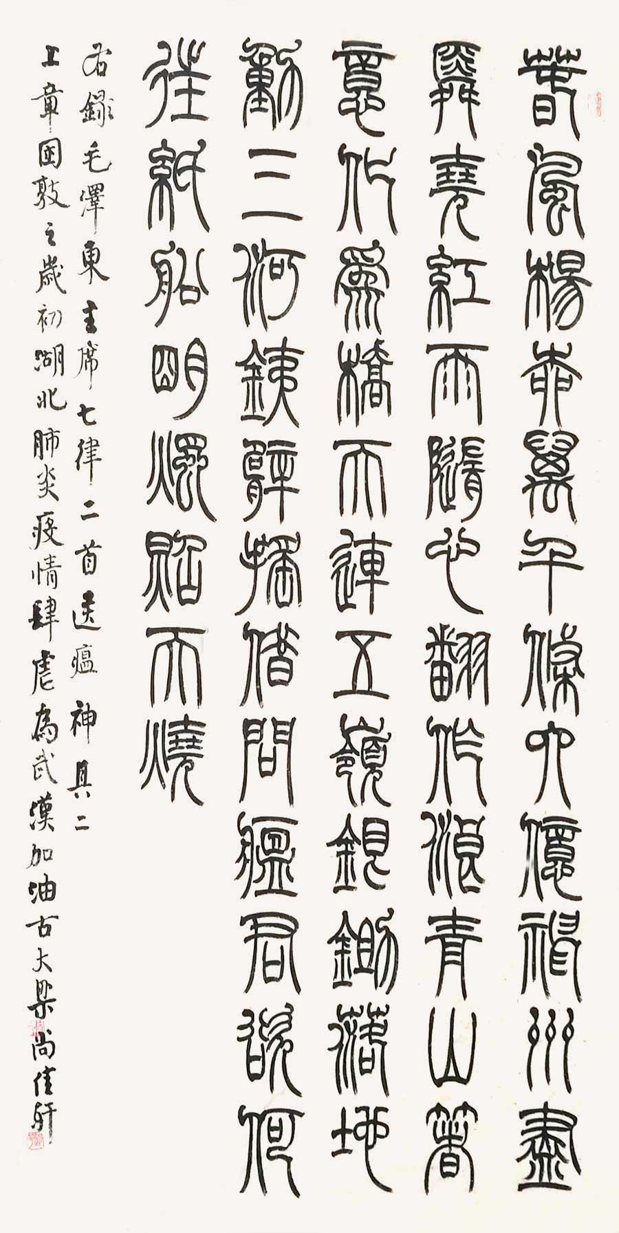 庚子新春,一场来势汹汹的新型冠状病毒感染的肺炎疫情在全国蔓延。面对疫情,习近平总书记作出重要指示,要求“广泛动员群众、组织群众、凝聚群众。紧紧依靠人民群众坚决打赢疫情防控阻击战”。在武汉、在全国各地,无数奔赴在疫情一线的工作人员同舟共济、众志成城,冒着各种风险坚守岗位,投身于这场必须打赢的疫情防控狙击战。在这场抗击疫情的战斗中,文艺工作者不能缺席。中国煤矿文联迅速组织全行业文艺工作者积极行动起来,为坚决遏制疫情蔓延势头、打赢疫情防控阻击战鼓与呼,创作出一大批各种形式的文艺作品,鼓舞全民士气,致敬白衣天使,慰问病患同胞,传递人间真情,弘扬社会正能量。中国煤矿书法家协会迅速行动起来,组织煤矿书法家,用心研墨,以爱为纸,将自己的创作激情,化作了对疫情的关切之情,两天时间创作了数百件鼓舞士气,振奋精神的书法、篆刻作品。点画间传达了550万煤矿工人声援武汉,抗击疫情的信心和决心,表达了对江城武汉的祈福、对伟大祖国的祝愿。