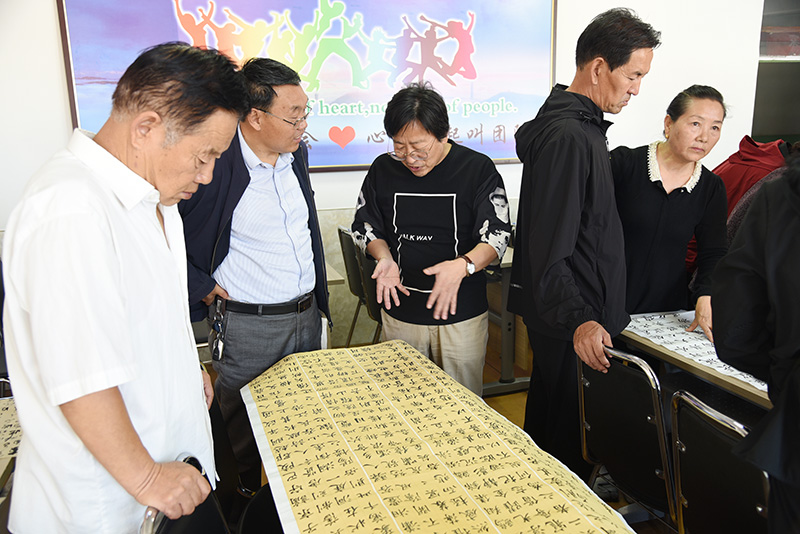 活动期间,进行了书画作品点评和创作交流。理念、技法,美学、哲学……每一位志愿者身边都围满了人,现场笑声、赞叹声、讨论声,热闹非凡。“这幅欧体写得不错,就是有些僵硬,建议临写一些行书,今后慢慢结体会灵活些”“除了笔画稍细些,结体小些外,还要注意字结构内紧外松”“这幅作品以褚遂良雁塔圣教序为基调,通篇气息和谐通畅,章法合理字法准确,很不错”“建议应注意加大线条的粗细变化对比,从而加强通篇作品的感染力”“楷书每一笔画皆为单一完成,要加强书写中笔与笔的连续性,以达气韵之生动。孙过庭书谱云‘真以点画为形质,使转为性情’同为此理……”
