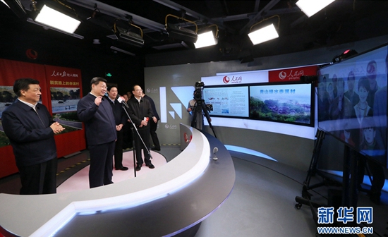 2月19日,中共中央总书记、国家主席、中央军委主席习近平在北京主持召开党的新闻舆论工作座谈会,并到中央新闻单位调研。这是习近平在人民日报社人民网演播室,通过视频同福建省宁德市赤溪村村民交流。新华社记者 兰红光 摄